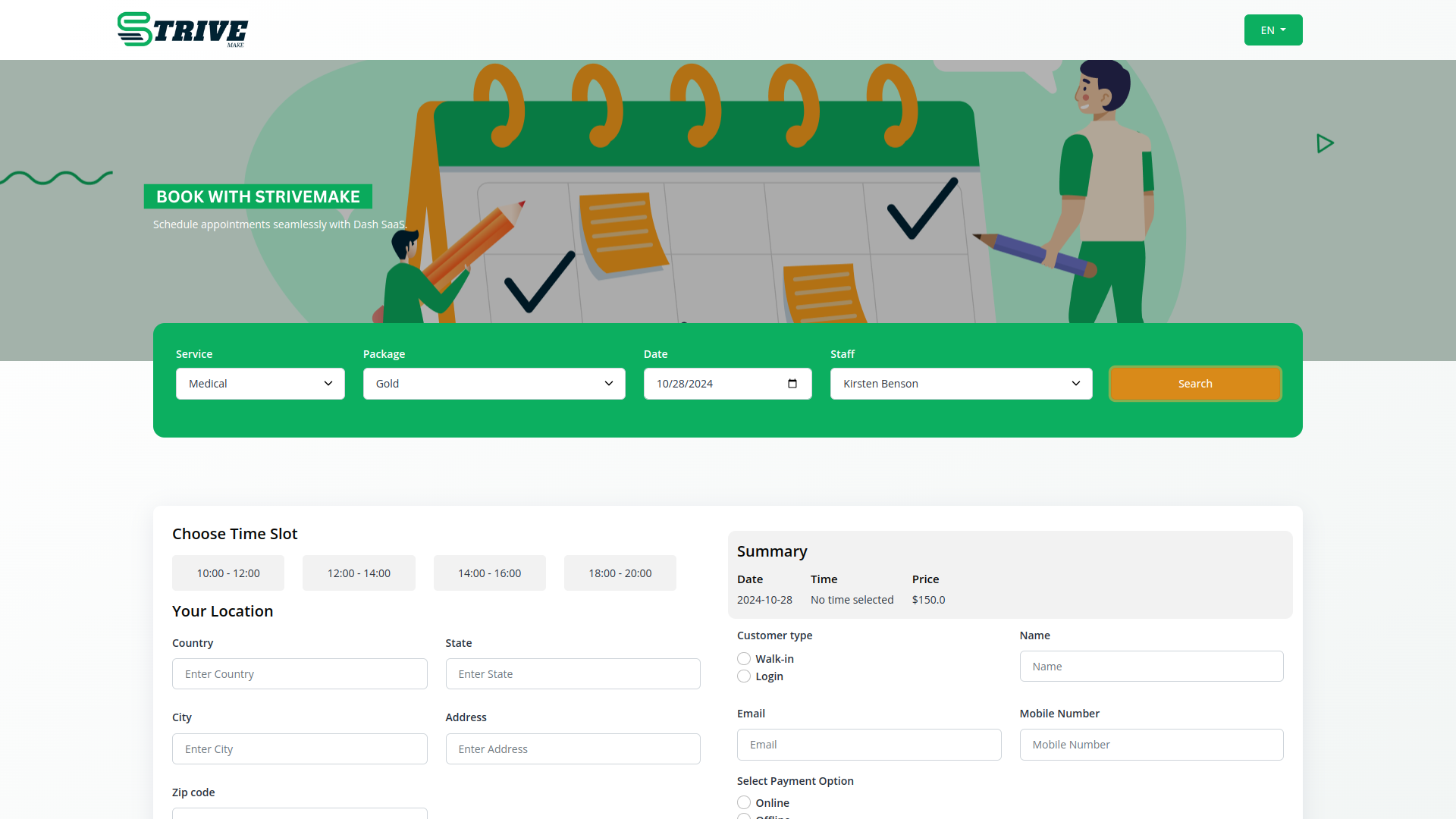 With the StriveMake Bookings Module, customers can pay for their appointments online quickly and securely. We support major payment gateways like Stripe and PayPal, making it easy for clients to complete transactions. This feature not only enhances convenience but also ensures that payments are processed efficiently, reducing the risk of missed payments and improving your cash flow. Offering online payment options helps streamline your business operations and provides a seamless experience for your customers.
