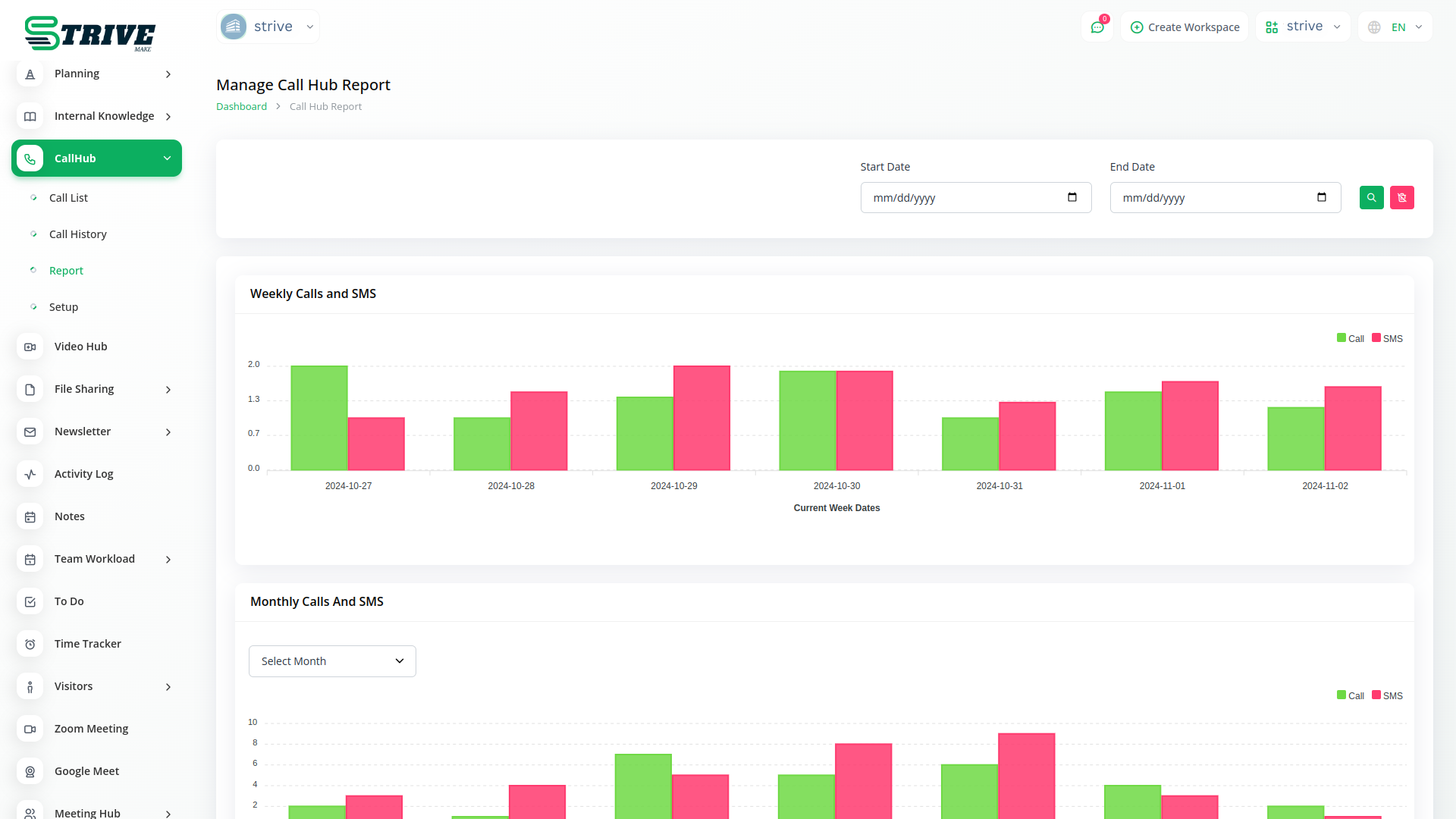 Call Hub provides robust reporting capabilities.Track the number of calls and SMS sent in a given month.Analyze communication patterns for a specific week.