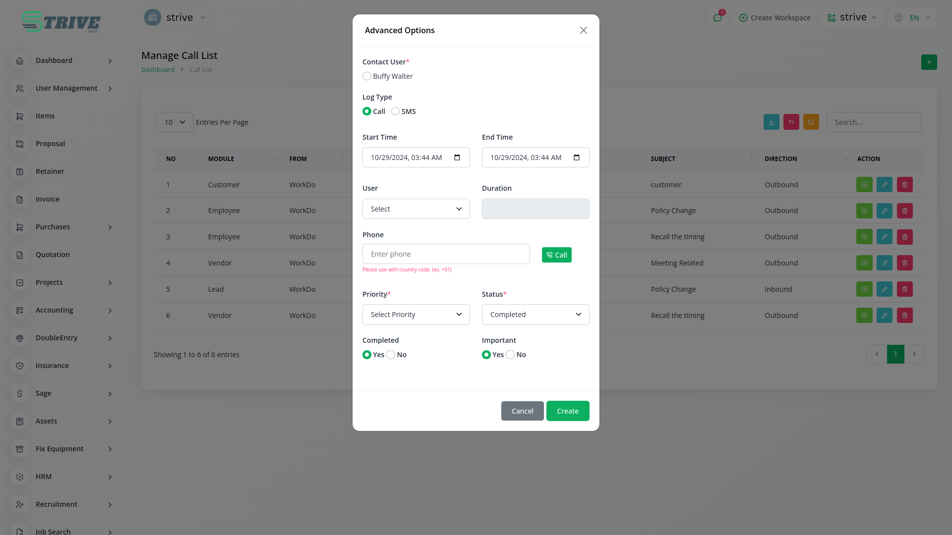 Choosing between a call or SMS communication. From the starting time and the ending time, the duration between that will counted automatically.Assigning a specific user responsible for the call and sms. Writing a custom message to send to the employee, client, or customer. Also this provide a functionality One-click call functionality to reach out to the contact instantly and One-click send message functionality for immediate messaging.