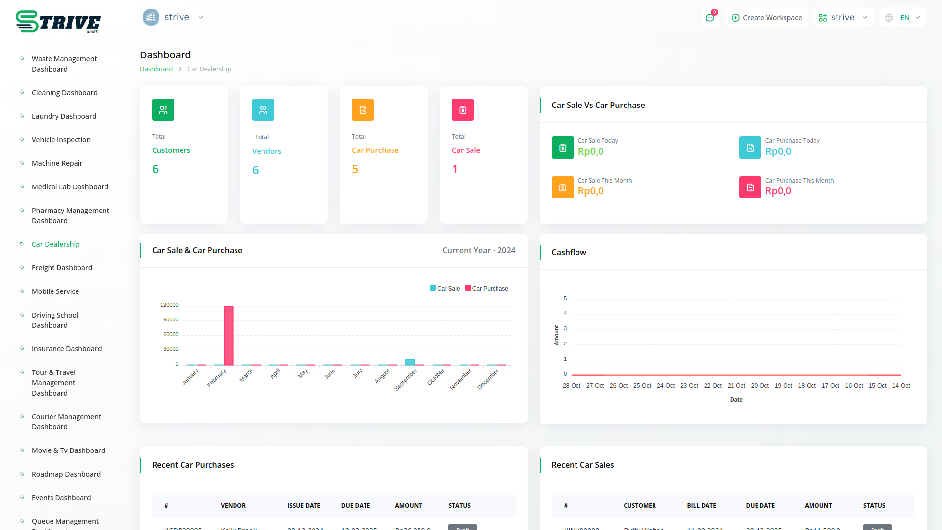 Welcome to StriveMake Car Dealership Integration! Your dashboard is the control center for your dealership, offering a comprehensive overview of performance metrics. Total customers and vendors are tracked, providing insights into your dealerships reach and supplier network strength. Additionally, total car purchases and sales metrics offer vital information for evaluating operational efficiency. The bar graph comparing car sales to purchases facilitates informed decision-making on inventory management strategies. Meanwhile, the cash flow graph visually represents your dealerships financial health, aiding in budgeting and forecasting efforts.