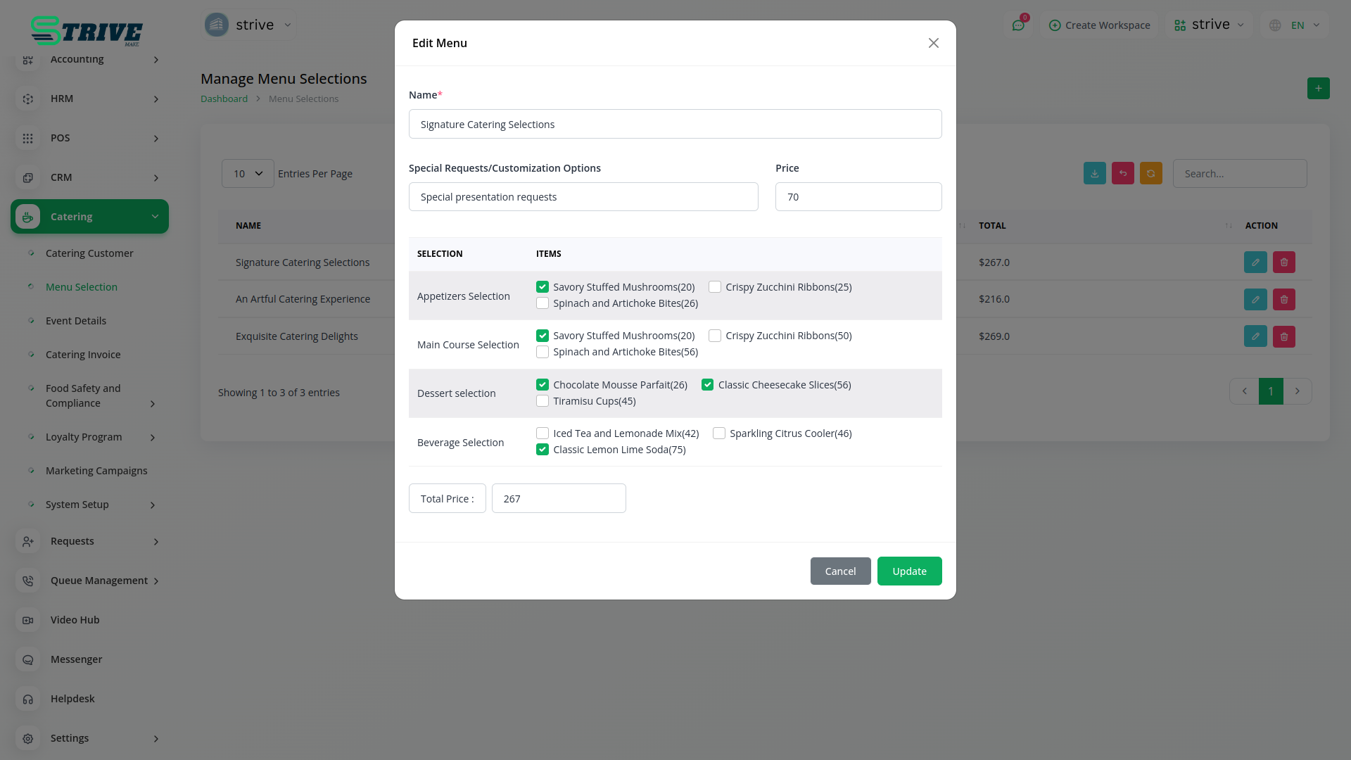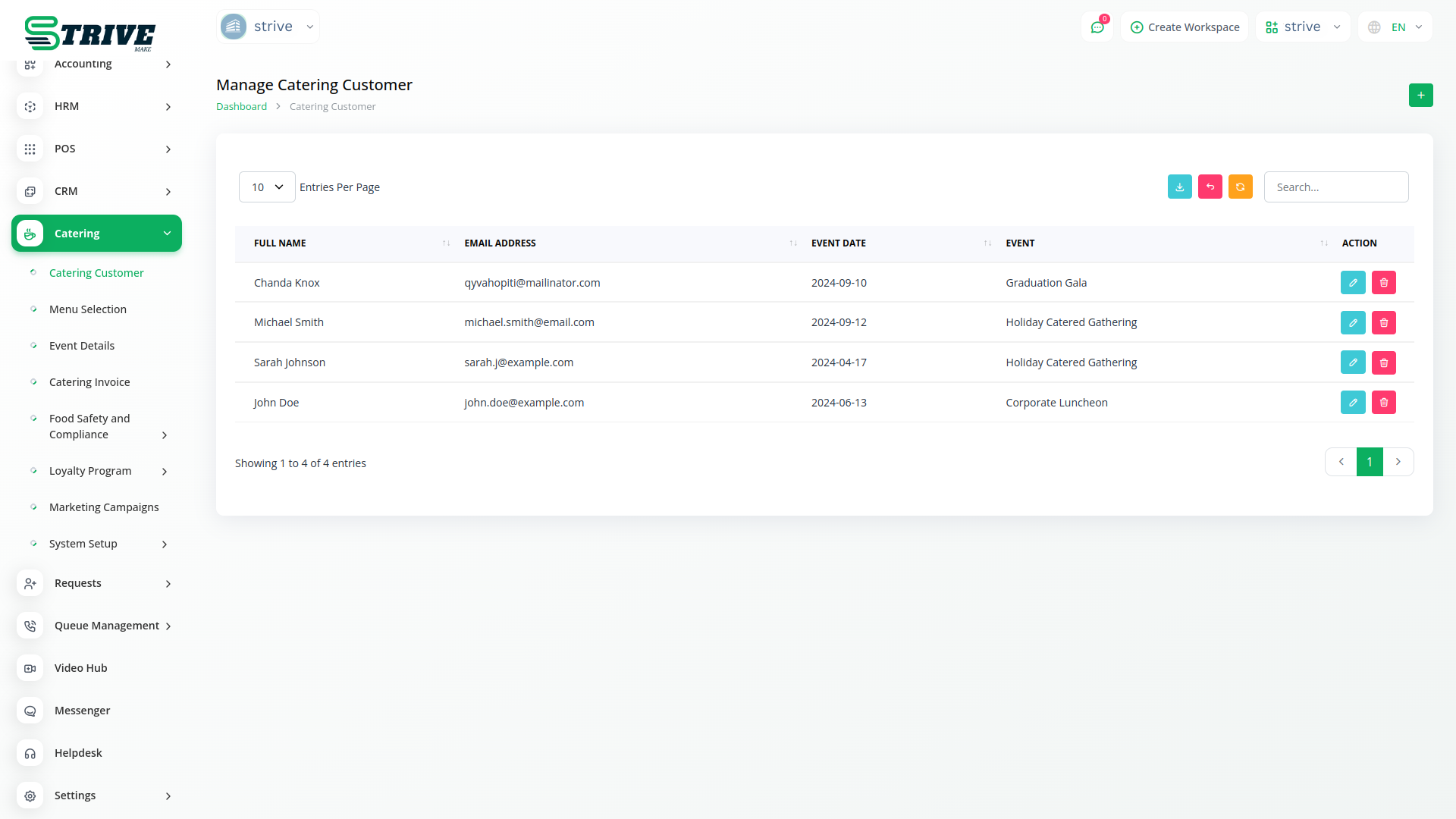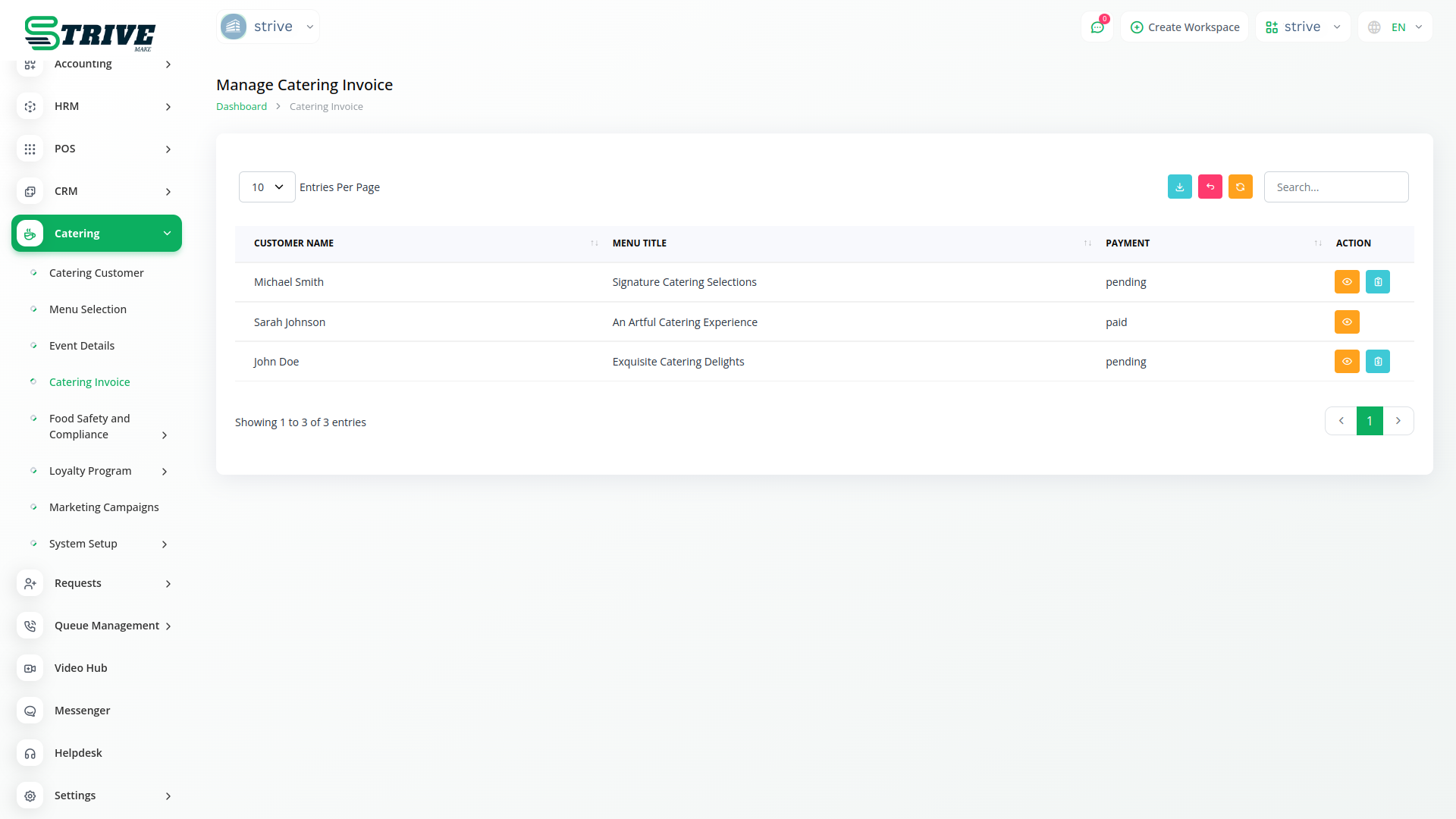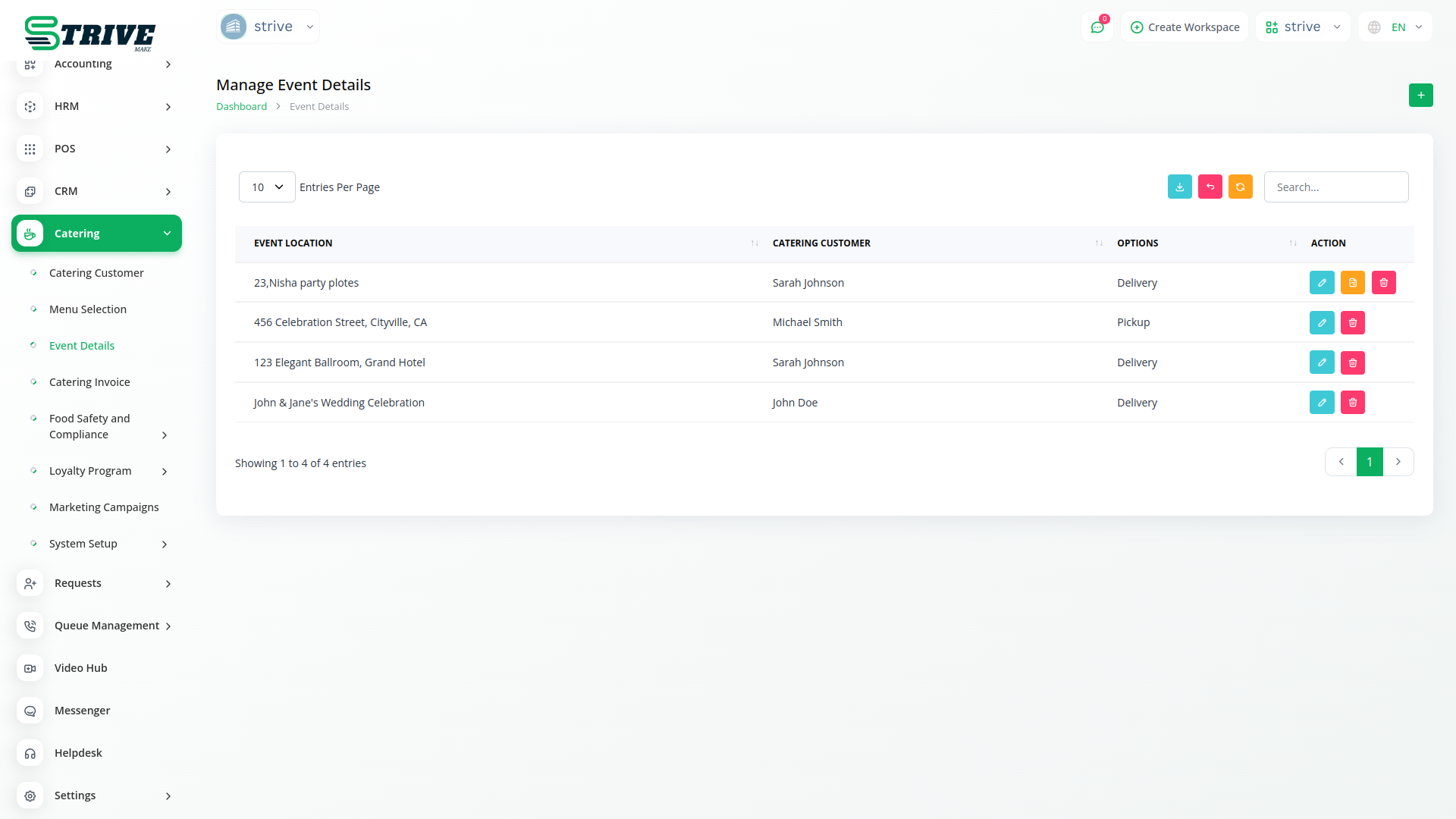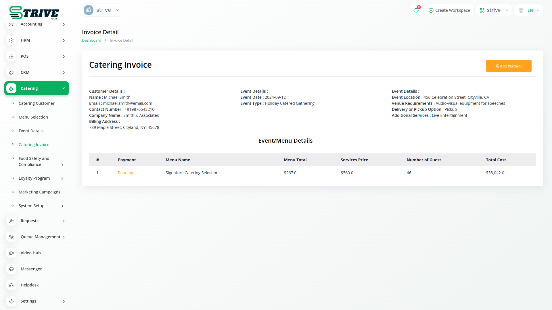 Introducing the Catering Management Module of StriveMake, your all-in-one solution for efficiently managing catering services. With our intuitive platform, you can effortlessly oversee every aspect of your catering business, from customer management to menu selection, event details, and invoicing.