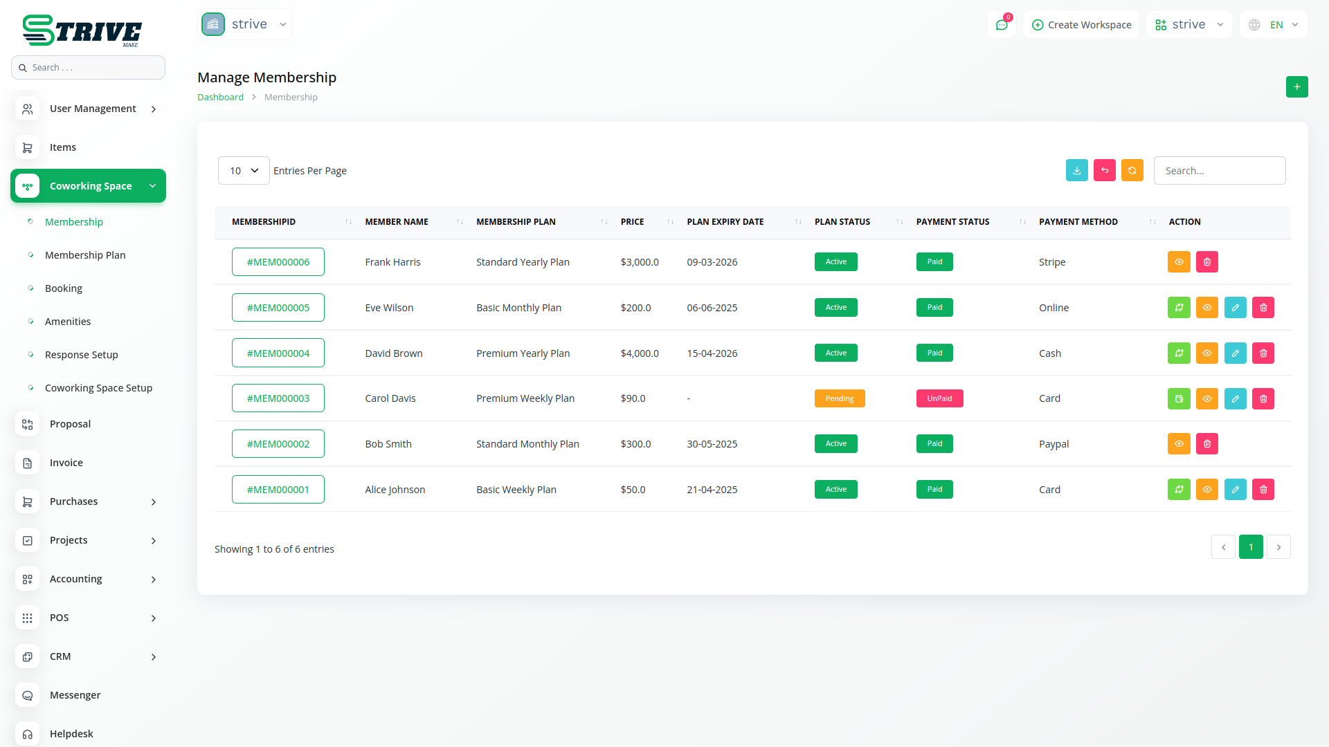 Easily create and manage weekly, monthly, and yearly membership plans with custom pricing and assigned amenities. Admins can activate or deactivate plans, allocate workspaces, and track memberships seamlessly, ensuring a smooth coworking experience.