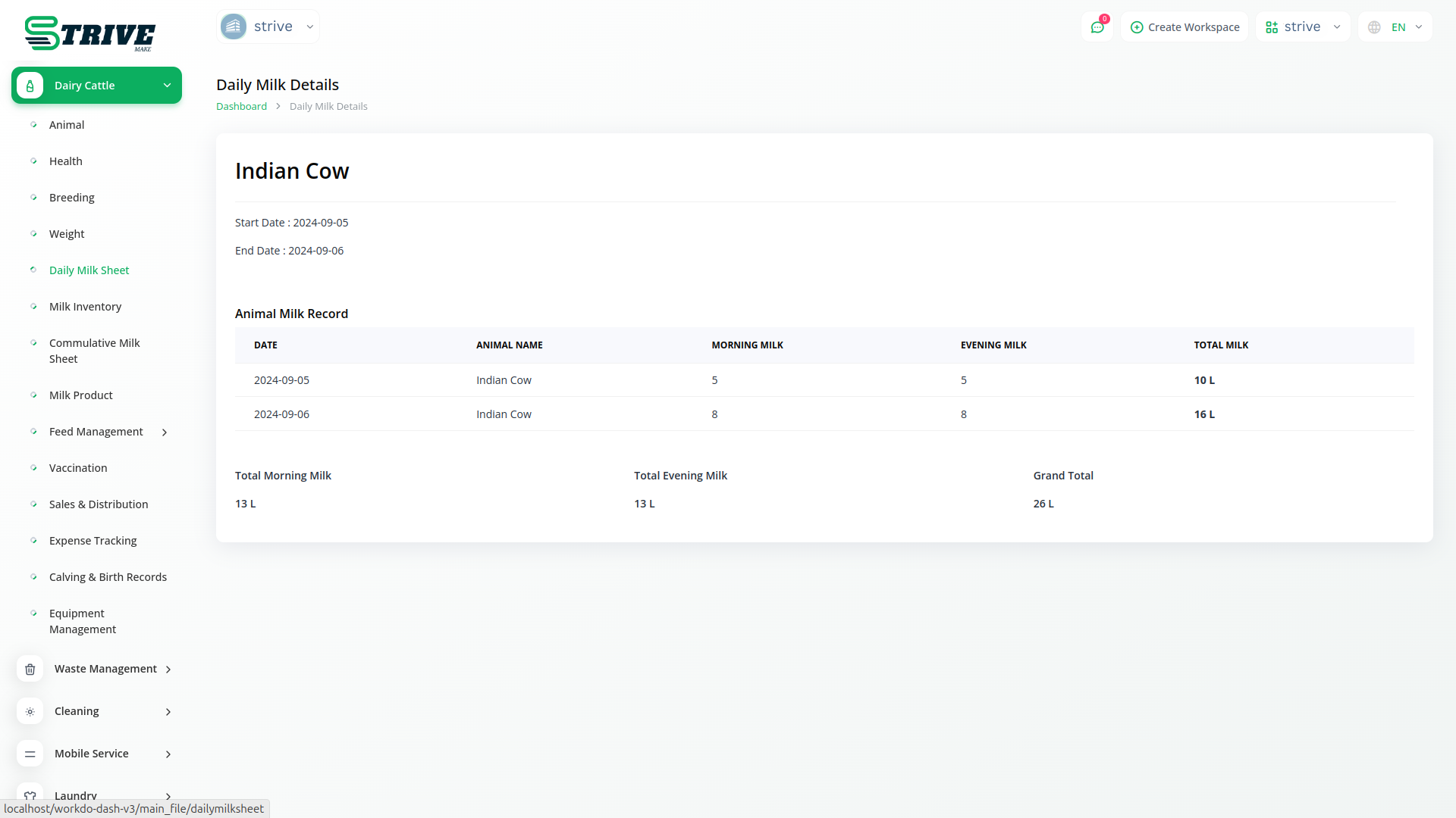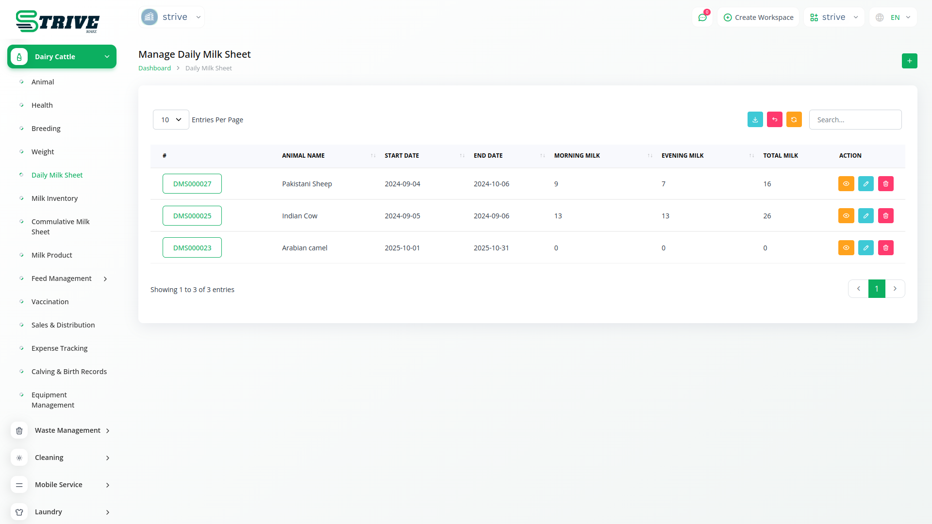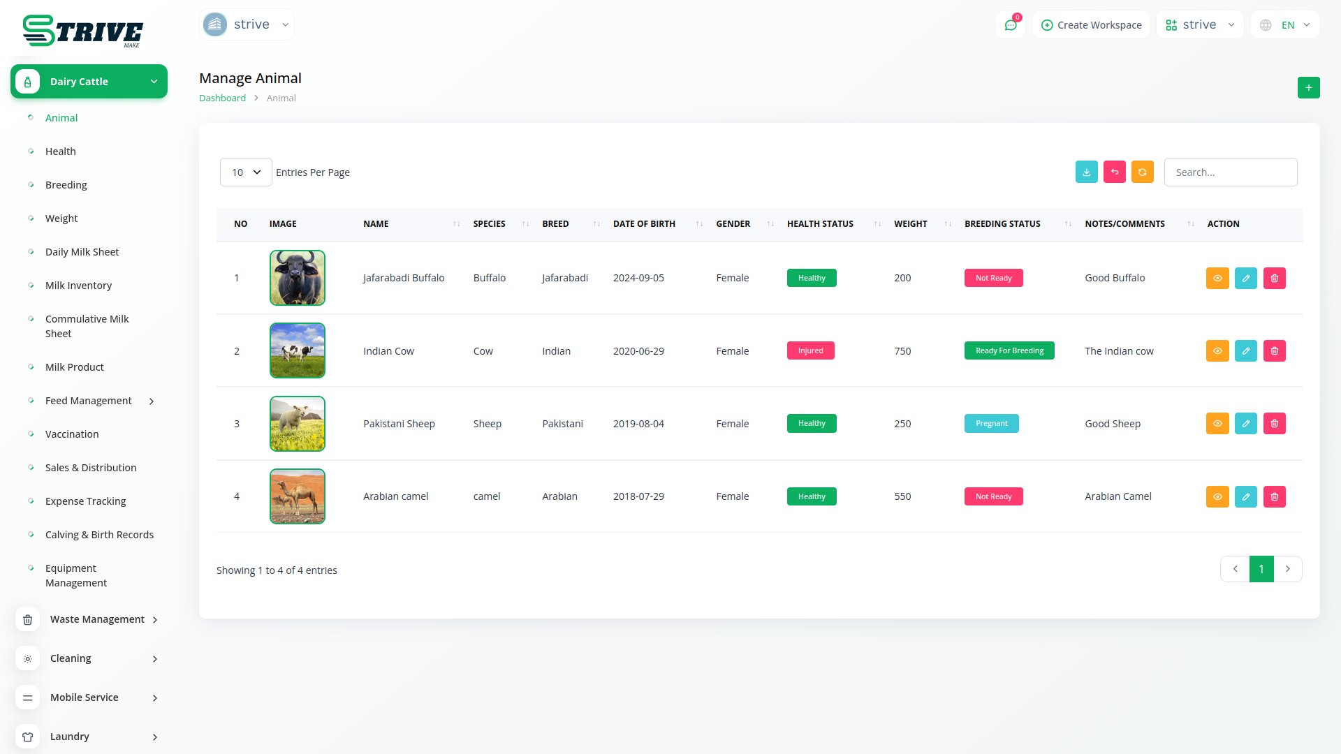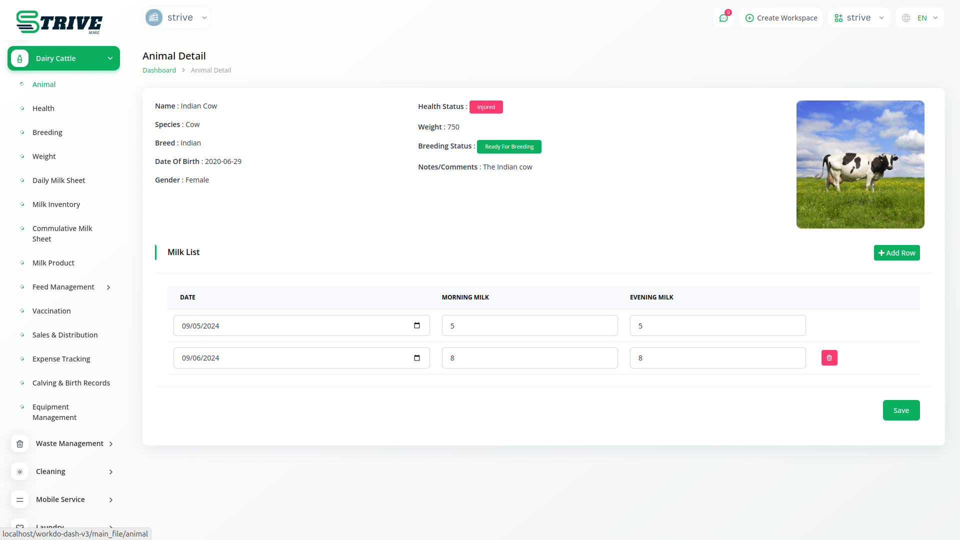 Dairy and Cattle Management module is your comprehensive solution for dairy cattle management. Our platform is designed to simplify the complexities of managing a dairy farm, offering seamless integration for tasks such as animal health monitoring, breeding management, weight tracking, daily milk yield recording, and milk inventory management. With StriveMake, you can efficiently oversee all aspects of your operation, ensuring the well-being of your herd while maximizing productivity.
