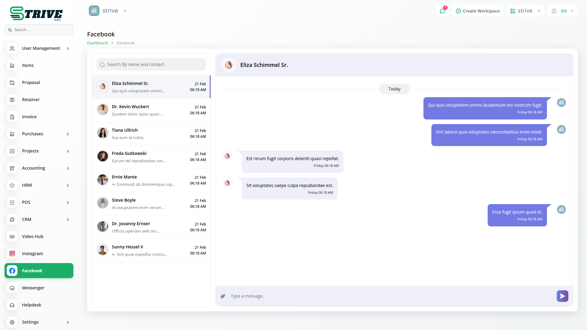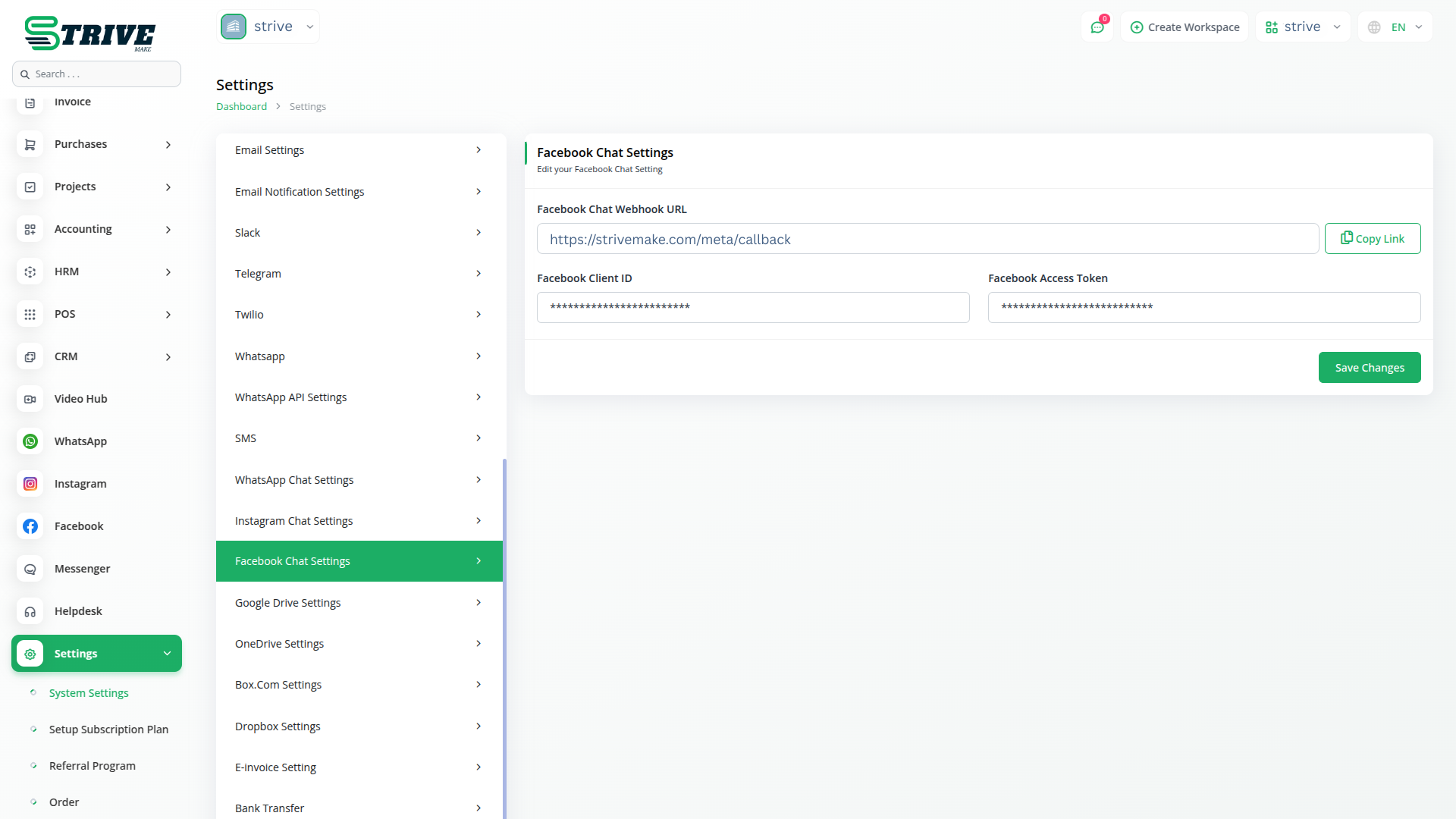 Connecting your Facebook account with StriveMake is quick and hassle-free. All you need to do is enter your Client ID and Access Token, and your Facebook Chat will be linked to the portal. Once set up, all incoming messages will automatically sync, allowing your team to respond instantly without needing to check Messenger separately. This integration helps businesses keep track of all conversations, ensuring that no message is missed. Whether you’re managing customer inquiries, responding to sales queries, or handling support requests, this feature makes communication smooth and effortless.