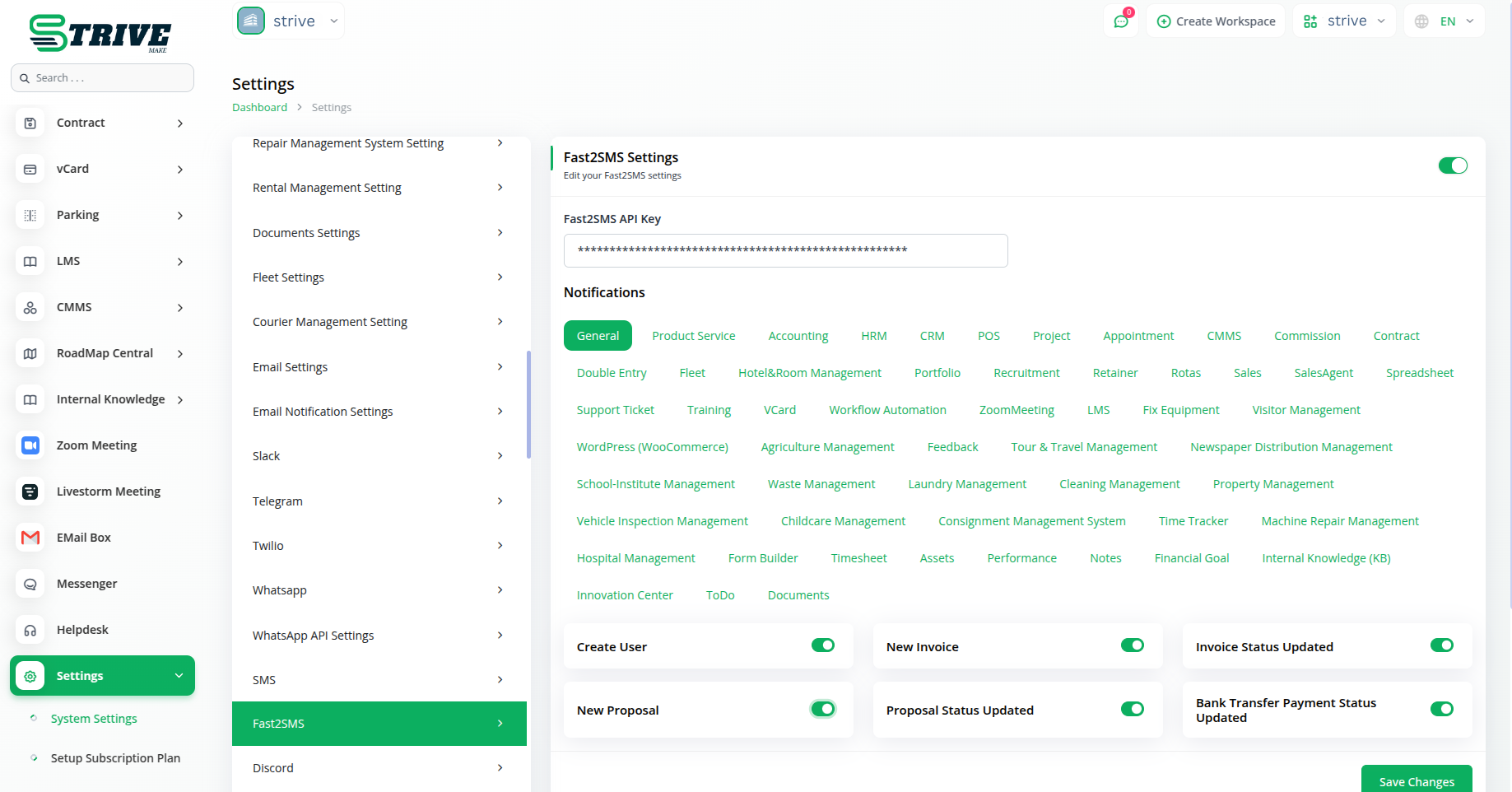 Setting up Fast2SMS in StriveMake is quick and simple. Just enter your Fast2SMS gateway details in the settings page and toggle notifications on or off based on your preferences. With reliable message delivery and seamless integration, you can trust that your s will reach you instantly without any delays.