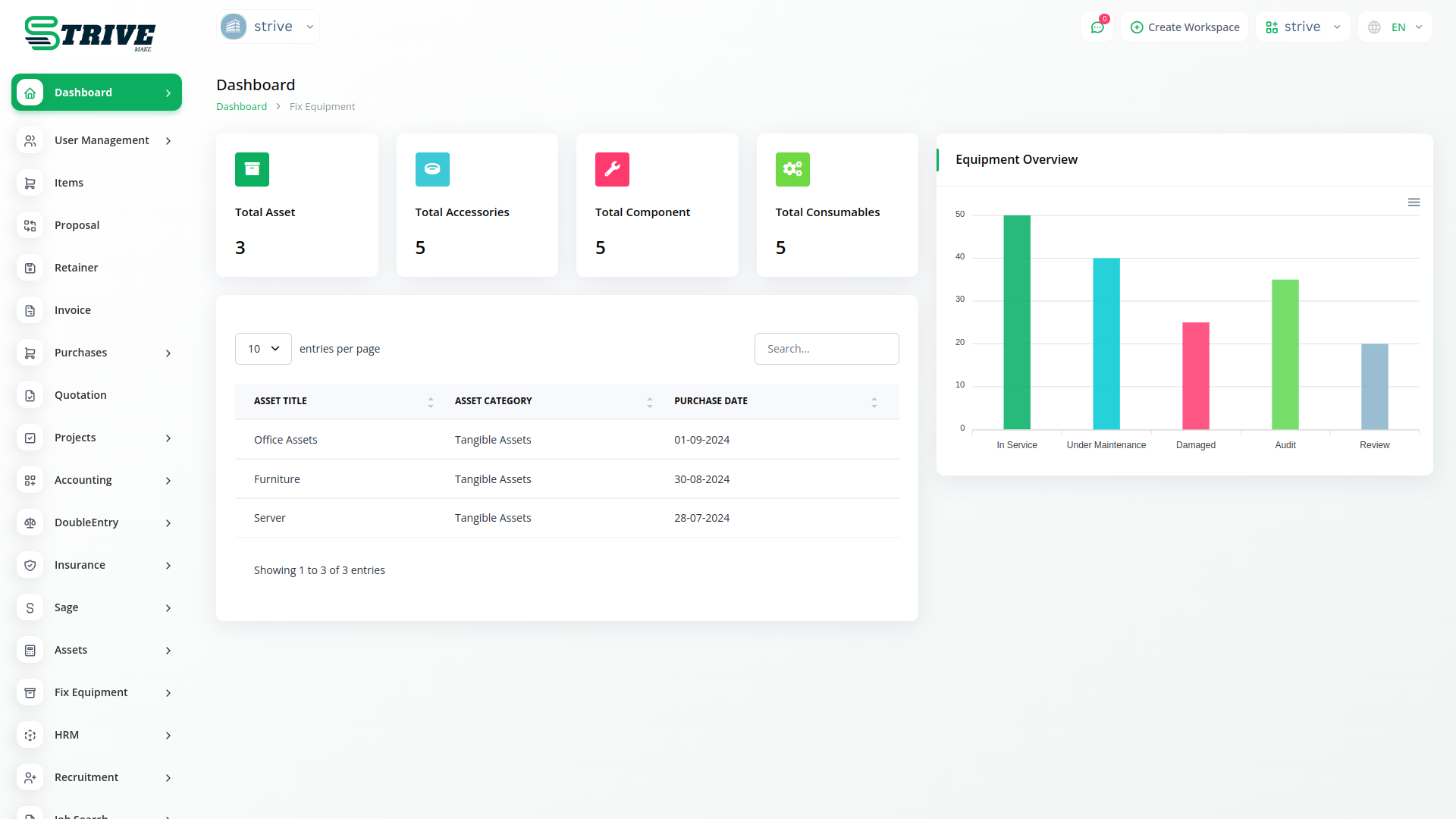Establish module for managing equipment, facilities, vehicles and other assets based on industry standards. Keep track of individual assets and schedule, assign and record maintenance work.