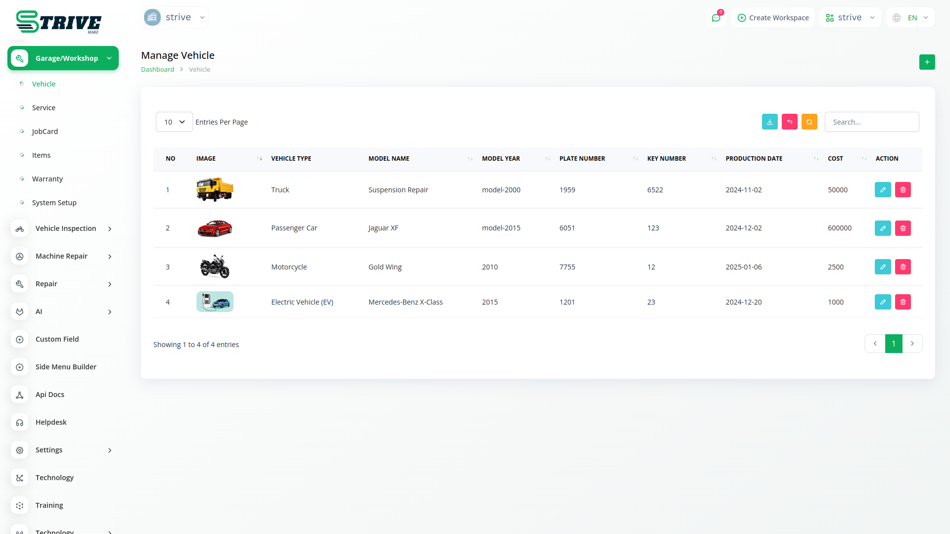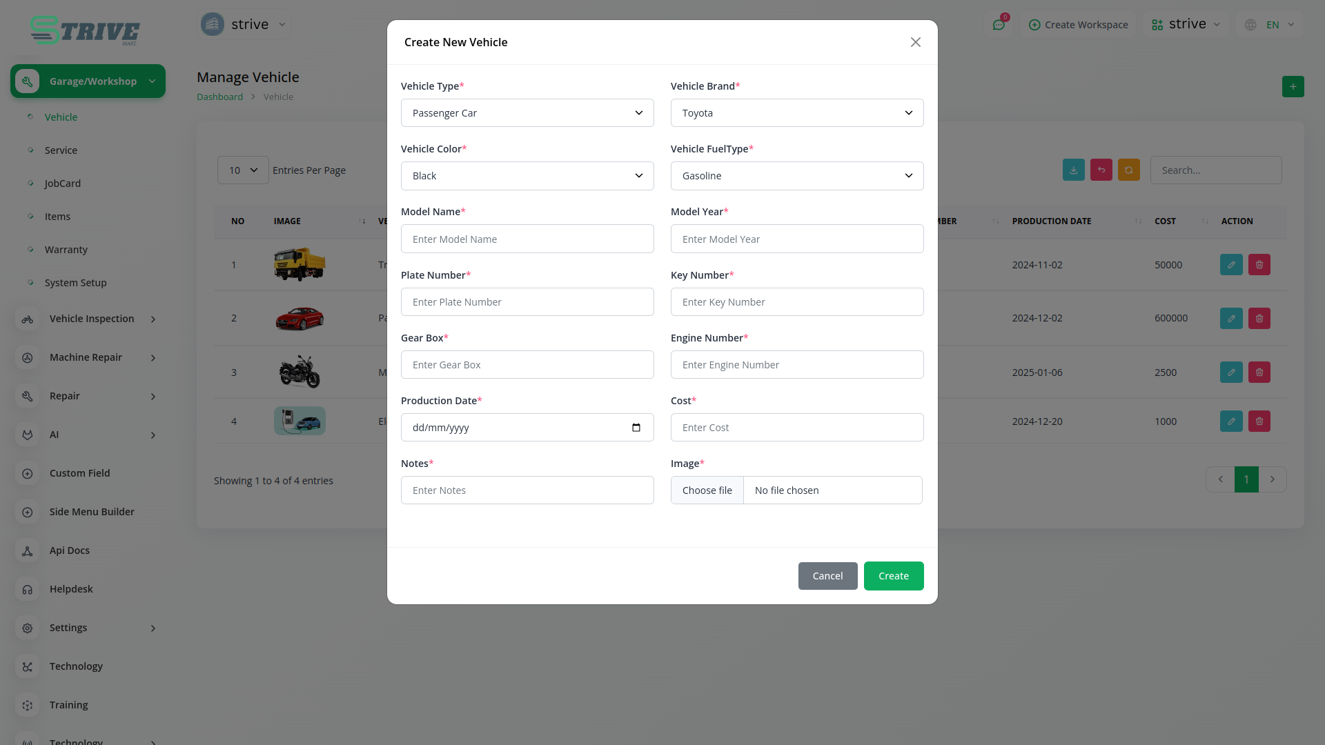 Garage/workshop management system streamlines operations by allowing seamless creation and tracking of vehicles and services. Effortlessly input vehicle specifics like make, model, and year for informed decisions. Define services with names, descriptions, and costs, aiding transparent cost estimation. This unified system catalogues services, empowering efficient workshop management and elevating customer satisfaction.