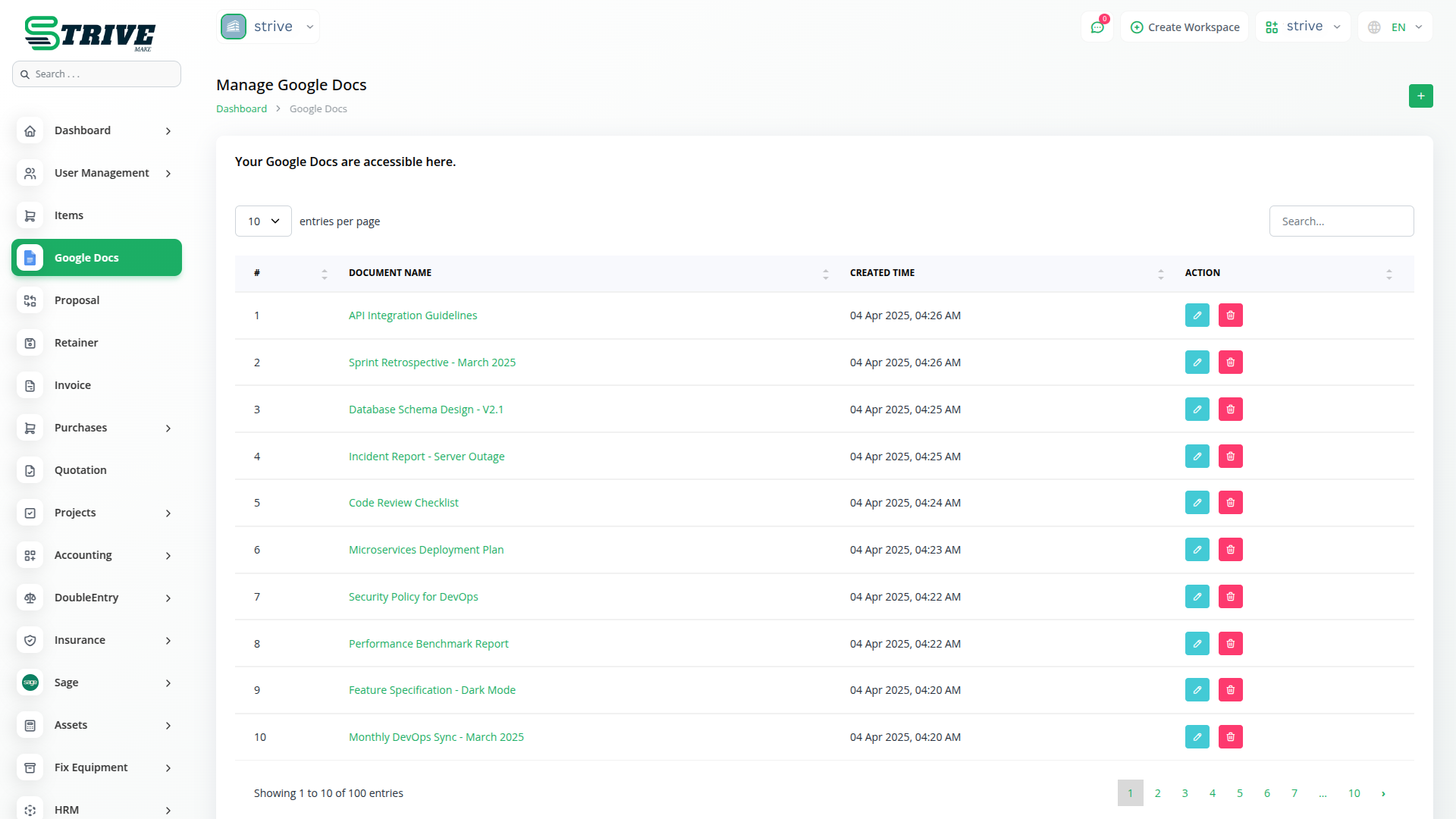 Each document title is clickable and opens directly in Google Docs, making it easy to view or edit in a new tab. The platform also provides Edit and Delete options beside each document, allowing quick changes or removal as needed. This streamlined setup enhances productivity and simplifies navigation across your Google Docs.