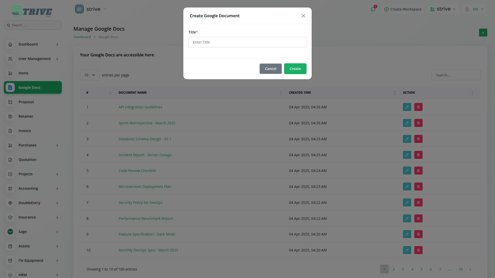 After authorization, a dedicated Google Docs section appears in the sidebar for easy navigation. You can create new documents instantly using the Create button. The interface lists all your Google Docs—both those you we created and documents shared with you—for seamless access. Everything is displayed in a clean, user-friendly layout.