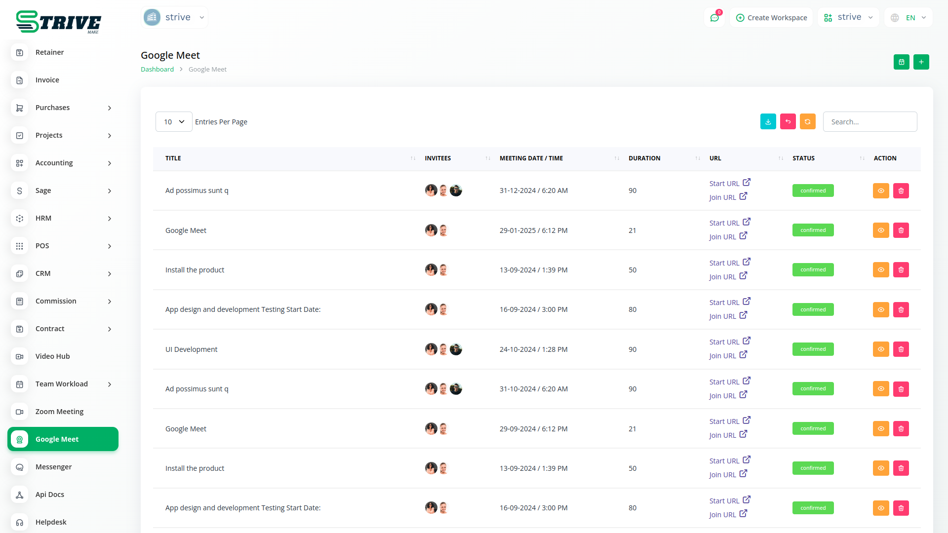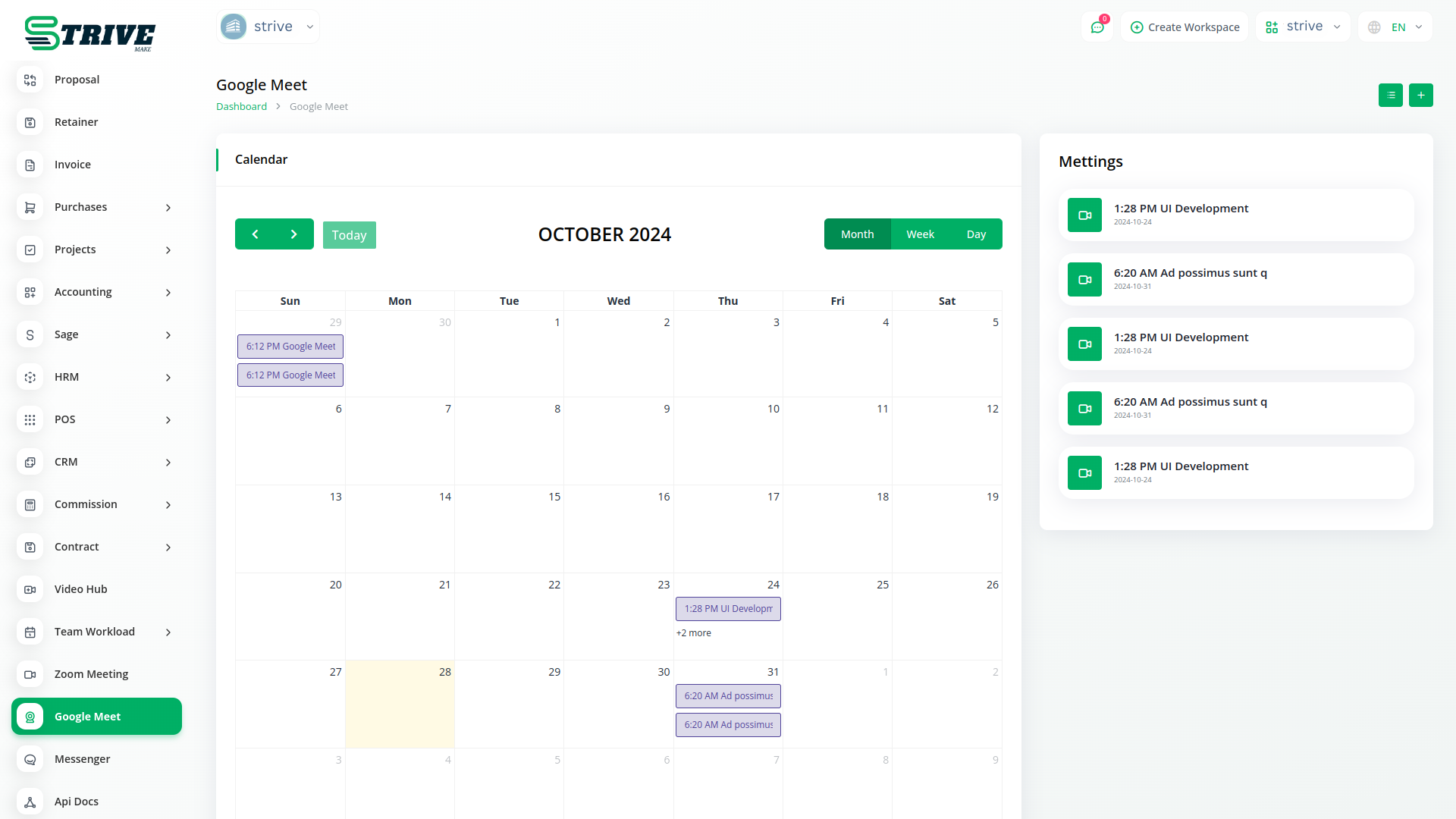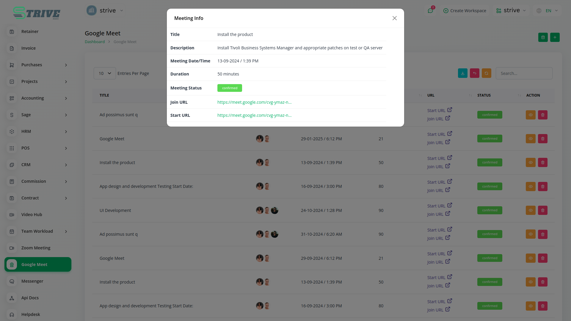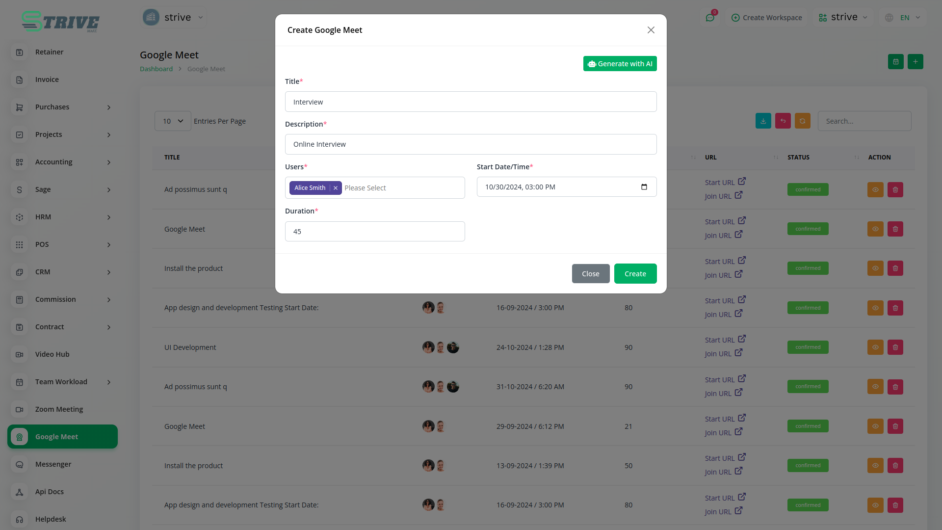 Empower your team with the ability to create and schedule Google Meet sessions instantly from within StriveMake. Simplify your virtual meeting experience by seamlessly generating Google Meet links, enhancing team collaboration and communication.