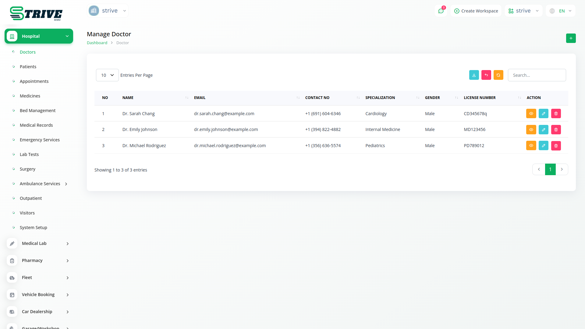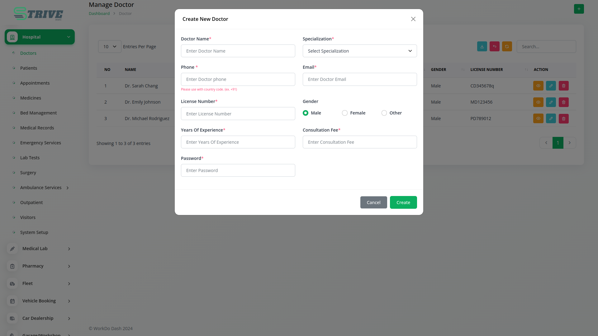 The hospital management system maintains a comprehensive database of all medical practitioners associated with the facility. Each doctor profile includes essential information such as their name, contact details, specialization, Years Of Experience, Consultation Fee, and license details.