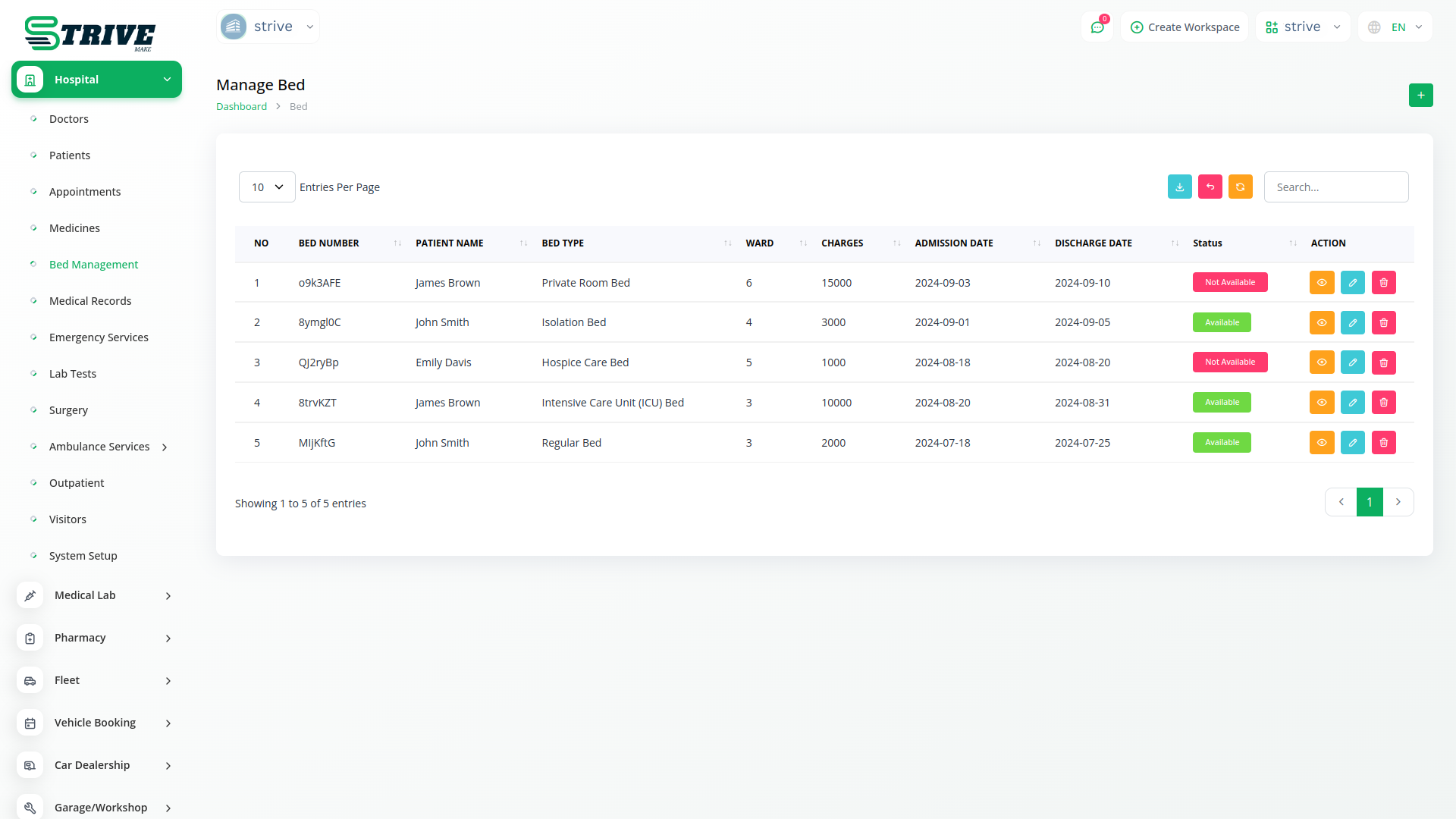 Bed management feature optimizes hospital bed allocation. In which the system provides Bed Type, Ward, Patient Assign, Charges, Admission Date, Discharge Date and Status allowing staff to efficiently assign beds based on patient needs.