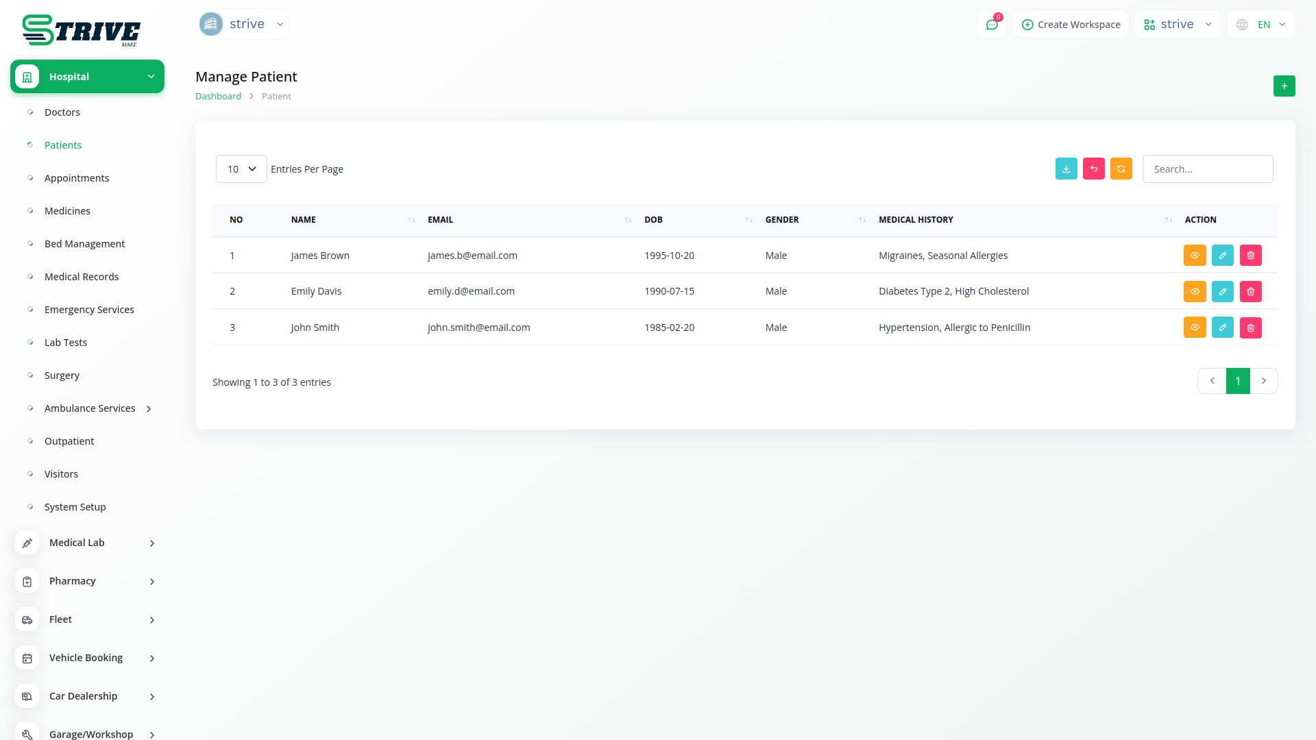 Patient records are meticulously organized within the hospital management system, containing vital information like the patient name, Email, Assign Doctor, Date of Birth, contact details, gender, Medical History and address. The system captures and updates the patients medical history, providing healthcare professionals with a thorough understanding of the patients health status.