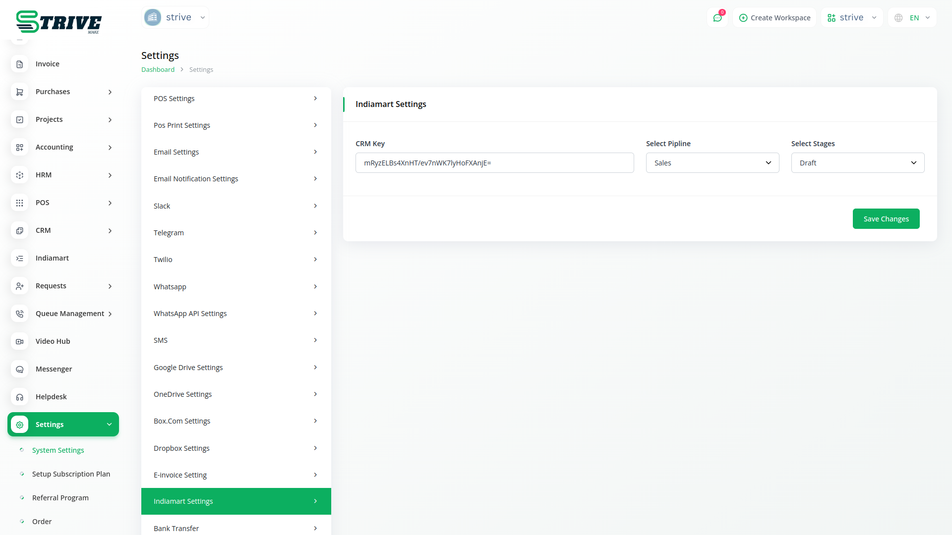 To integrate Indiamart with StriveMake, follow a straightforward process. Access the System Settings, proceed to Indiamart Settings, and input your CRM key. Select the appropriate pipeline and stage for your leads. This uncomplicated procedure establishes a robust connection, enabling a smooth flow of leads and data between the platforms.