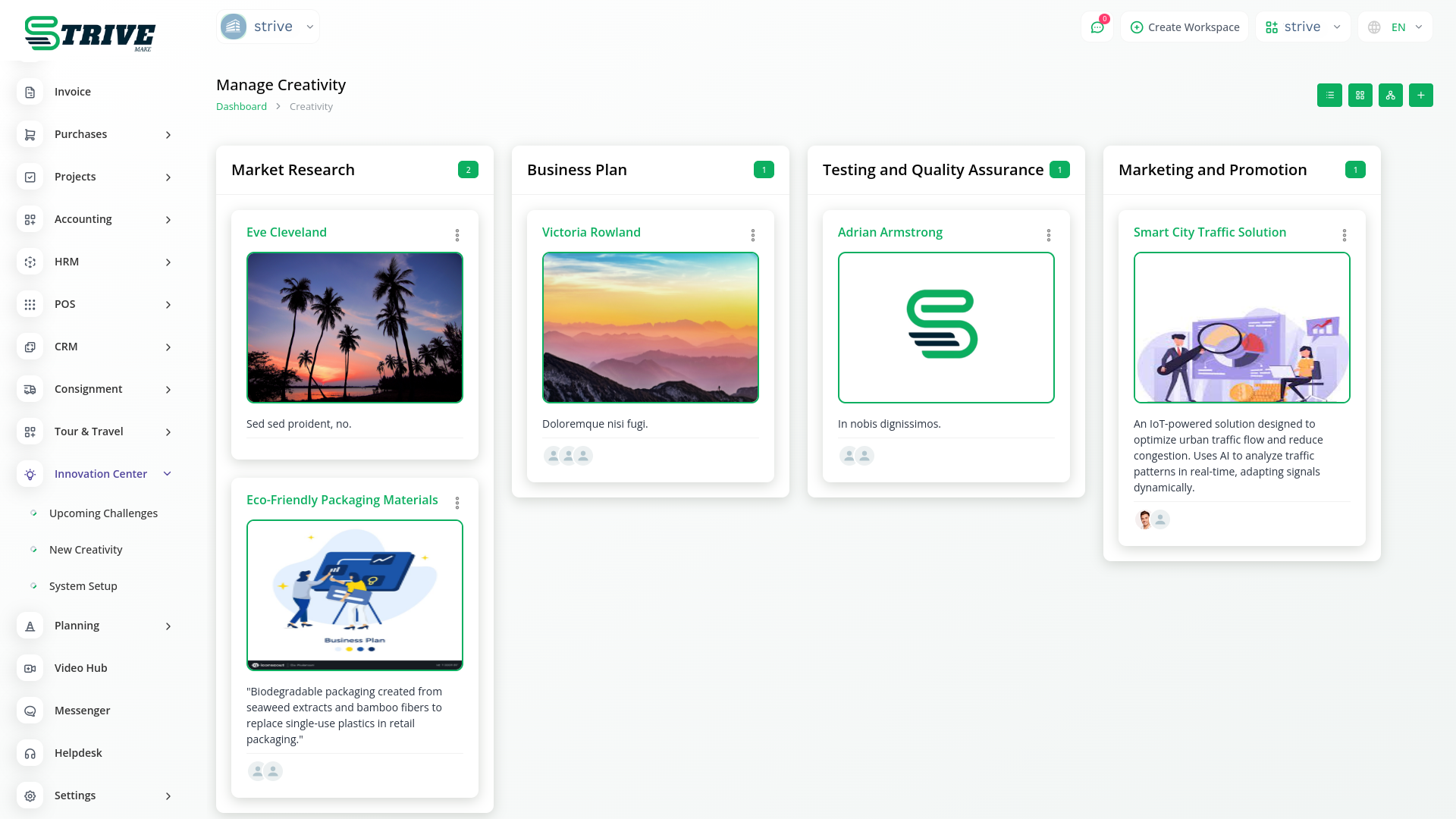 In the innovation center module, you can create ideas based on the challenge. You can provide an image, video, specify the type of users, and define the roles for those who can appreciate your creativity. Additionally, you can include multiple images and descriptions.