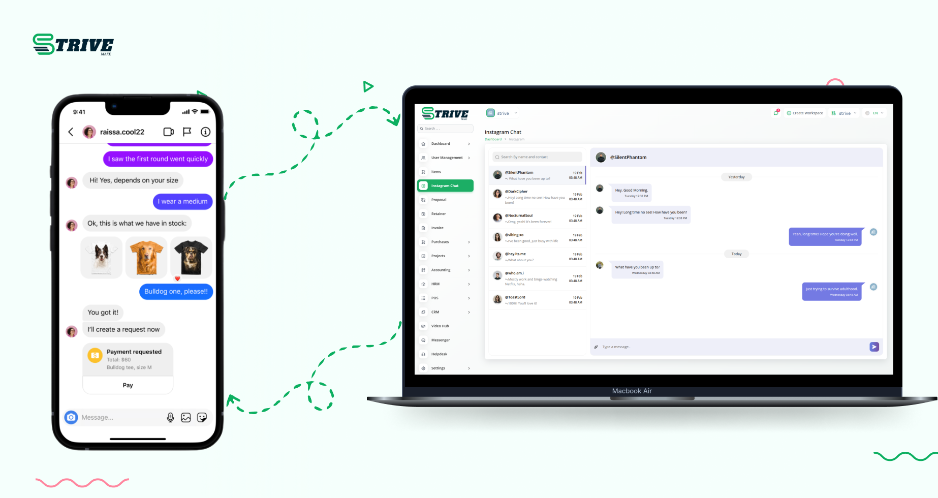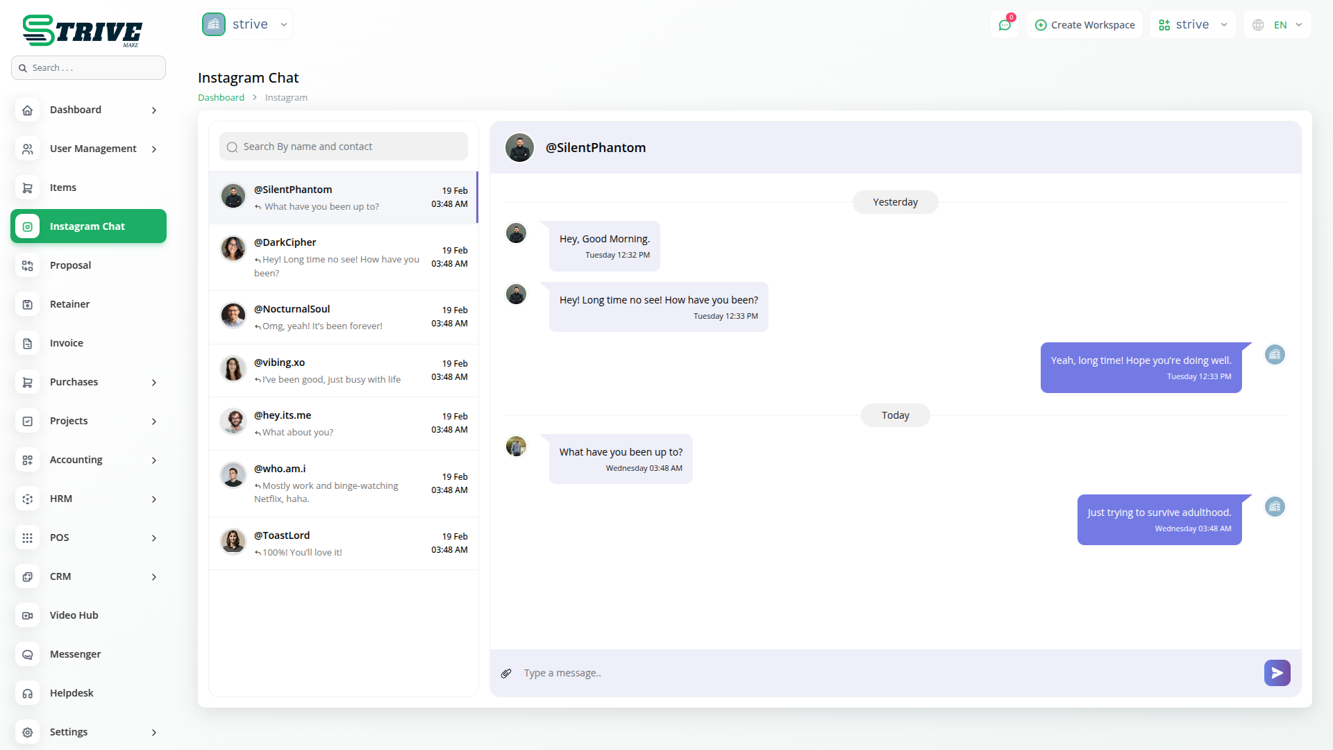 With the Instagram Chat module on StriveMake, you can effortlessly engage with your clients directly on Instagram, all from within the StriveMake portal. This integration allows you to centralize your customer interactions in one place, making it easier to manage conversations without constantly switching between apps. It’s the perfect tool to ensure your client communication remains smooth and organized.