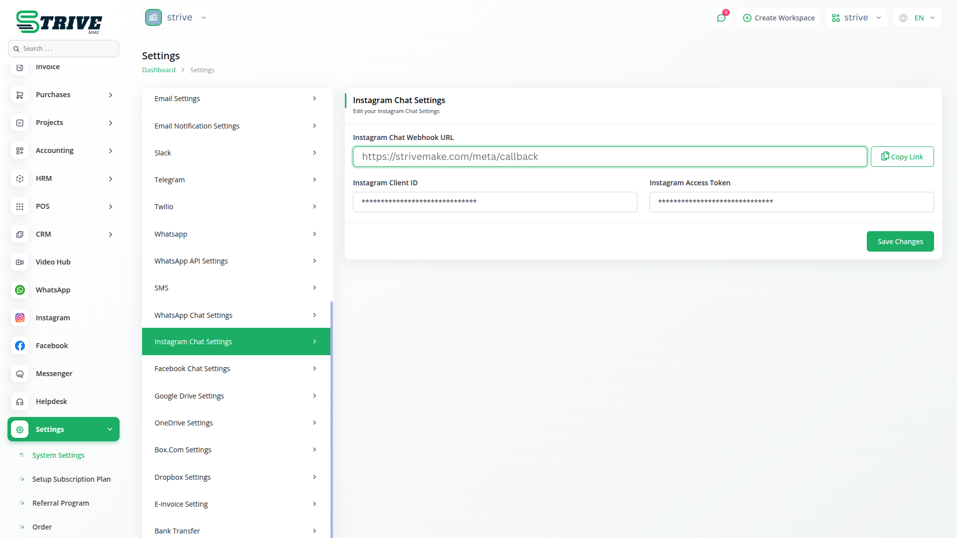 To get started, simply add your Instagram Webhook URL, Client ID, and Instagram Access Token into StriveMake. These details will connect your Instagram account to StriveMake and enable real-time message syncing. Once integrated, you can manage Instagram chats, share media, and respond to clients instantly—enhancing your customer service experience with ease.
