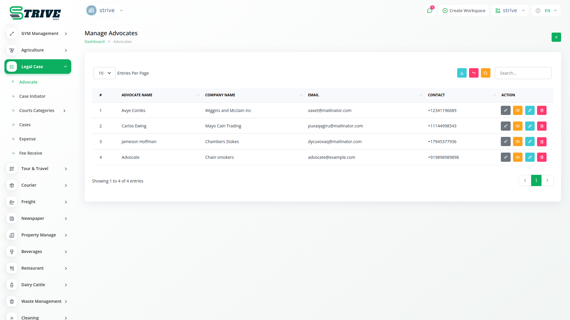 For advocates, the module offers a straightforward way to view and handle details such as names, company affiliations, and contact information. It provides essential actions like editing advocate information, resetting passwords, and deleting advocate records. This ensures that user interactions with advocate data are intuitive and effective.