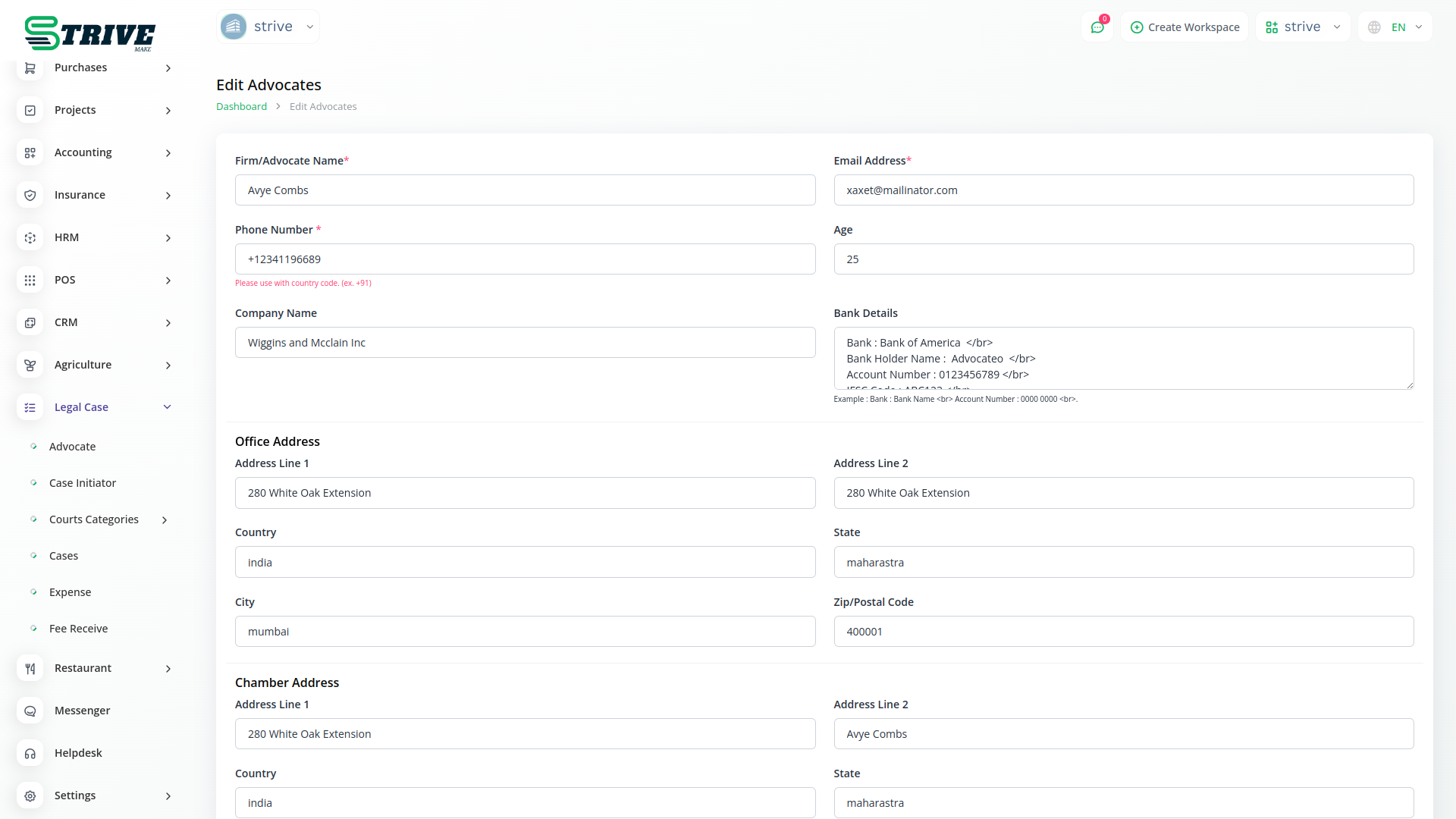 Explore the efficiency of the StriveMake Legal Case Management Hub, a dedicated tool designed for streamlined management of advocates, case initiators, and legal proceedings.With a user-friendly interface, this module simplifies advocate details, offering actions like editing information, resetting passwords, and deleting records. Gain insights into case details, client hearings, bills, and fees for efficient case initiator management.