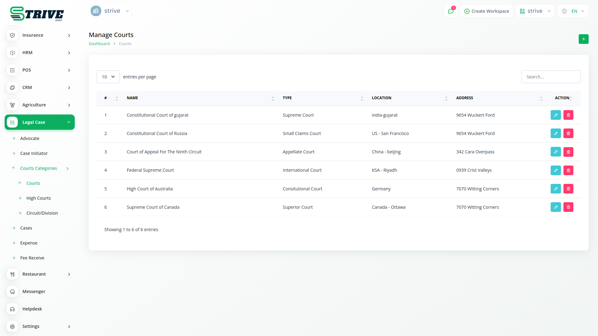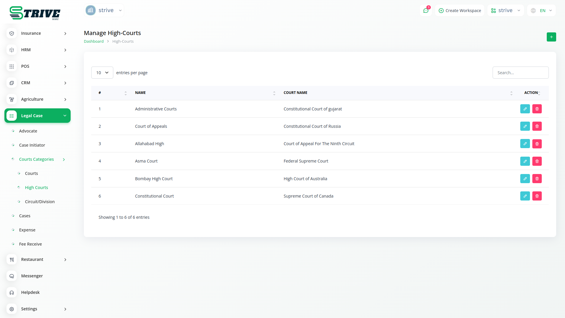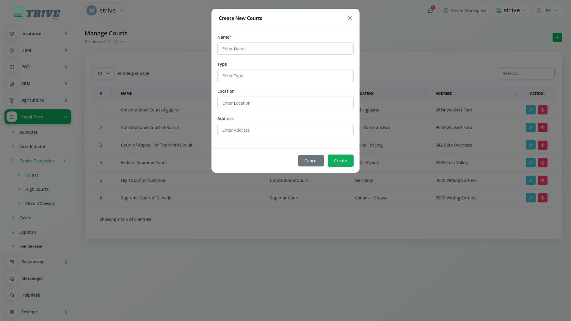 The Legal Case Management module in StriveMake is a dedicated tool for simplifying legal processes. With a user-friendly interface, it allows users to efficiently manage information related to advocates, case initiators, and court categories. This module serves as a central hub, facilitating the organization and accessibility of critical legal data within the broader StriveMake platform.