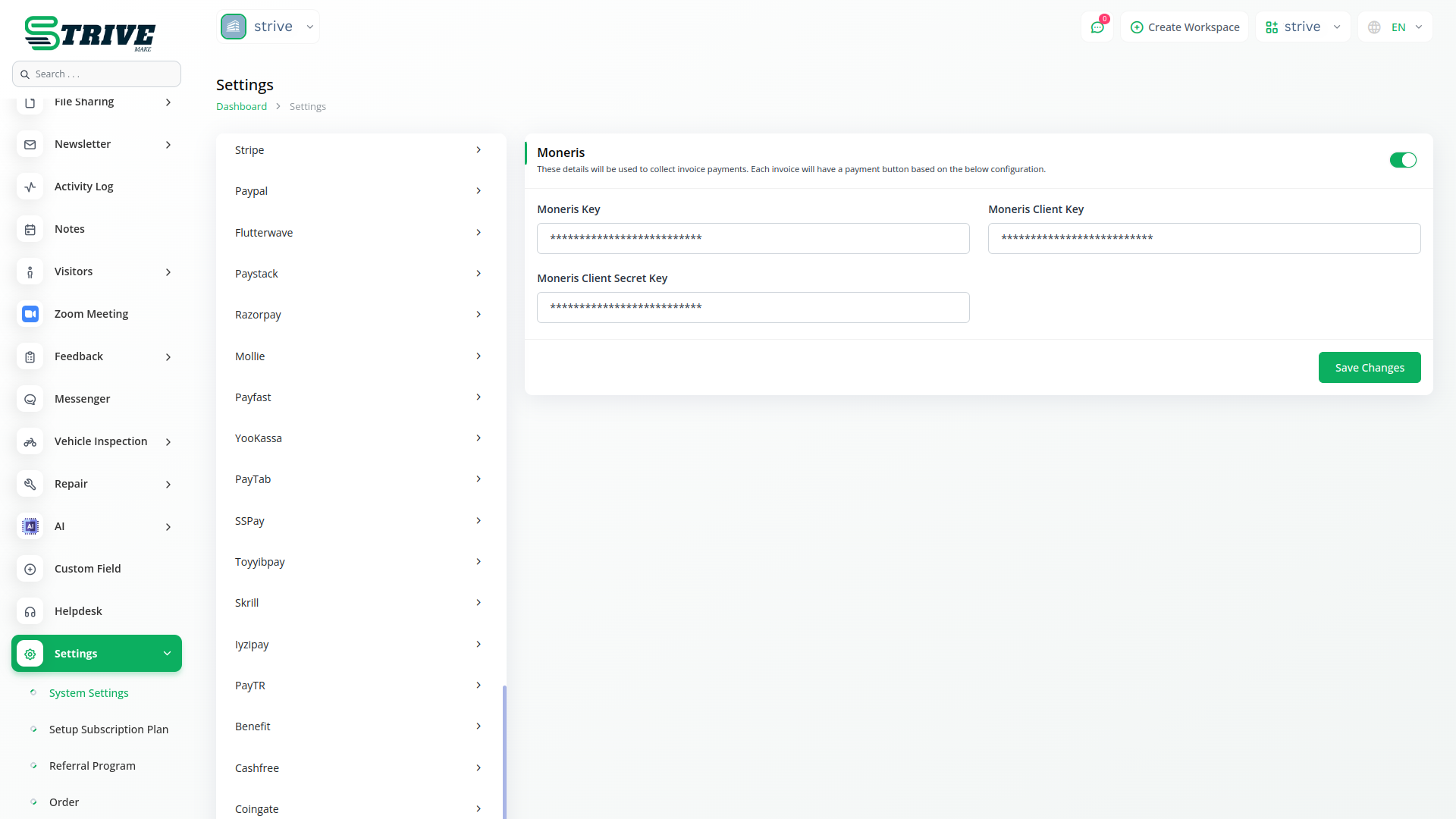 The API Key Settings Page for Moneris Integration allows you to securely connect your application or website with the Moneris payment gateway. By configuring your API keys on this page, you enable your platform to interact with Moneris services, providing seamless payment processing and transaction management. Both Superadmin and Company accounts can utilize this integration, though each has a specific focus. The Superadmin integration is primarily for handling subscription-based payments, while the Company integration handles payments related to invoices and other one-time transactions. Both roles share the same integration setup, ensuring ease of use and consistency across the platform.
