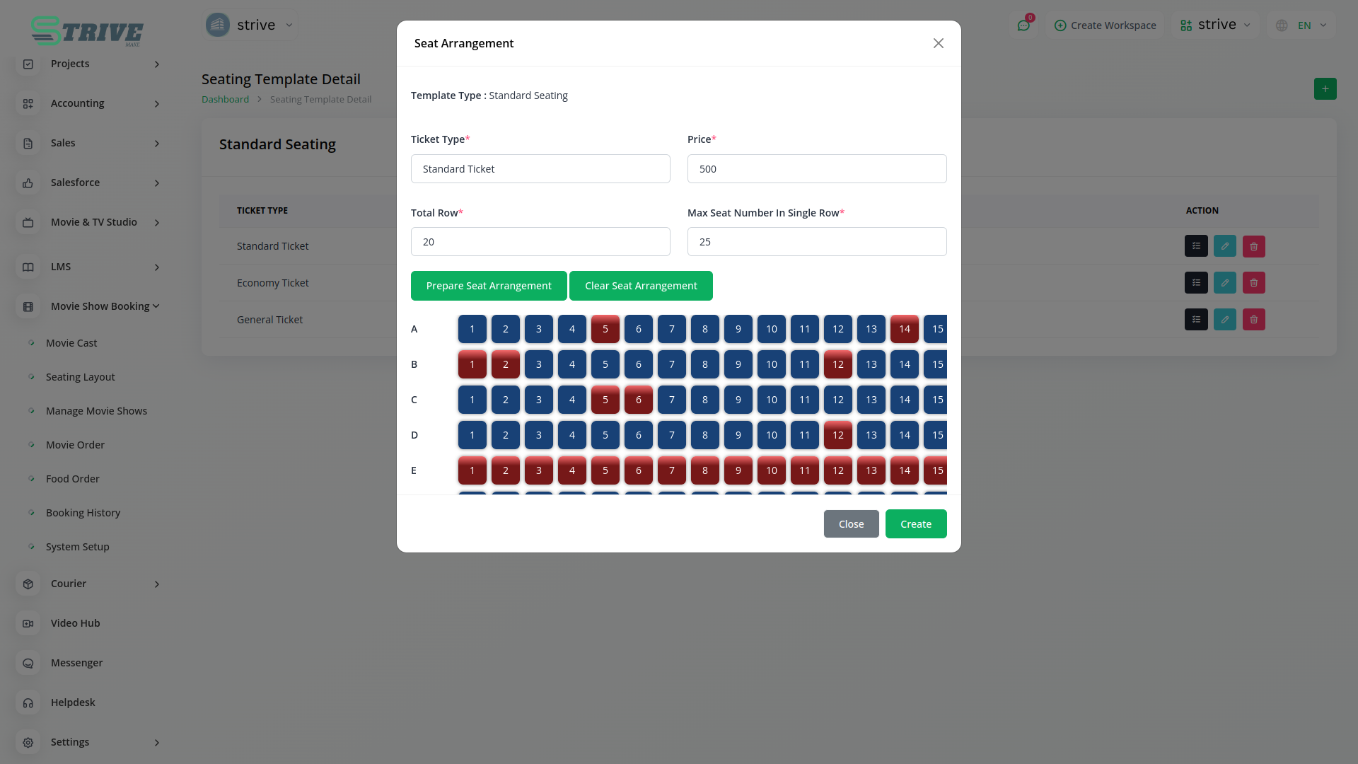 Our platform allows you to arrange seats as per your choice effortlessly. With our intuitive interface, you can drag and drop seats to create layouts that cater to your theaters specific needs. Whether you are optimizing space for a blockbuster premiere or creating a cozy atmosphere for an intimate screening, StriveMake empowers you to customize seating arrangements with unparalleled ease. Say goodbye to rigid seating configurations and hello to a world of endless possibilities with StriveMake.