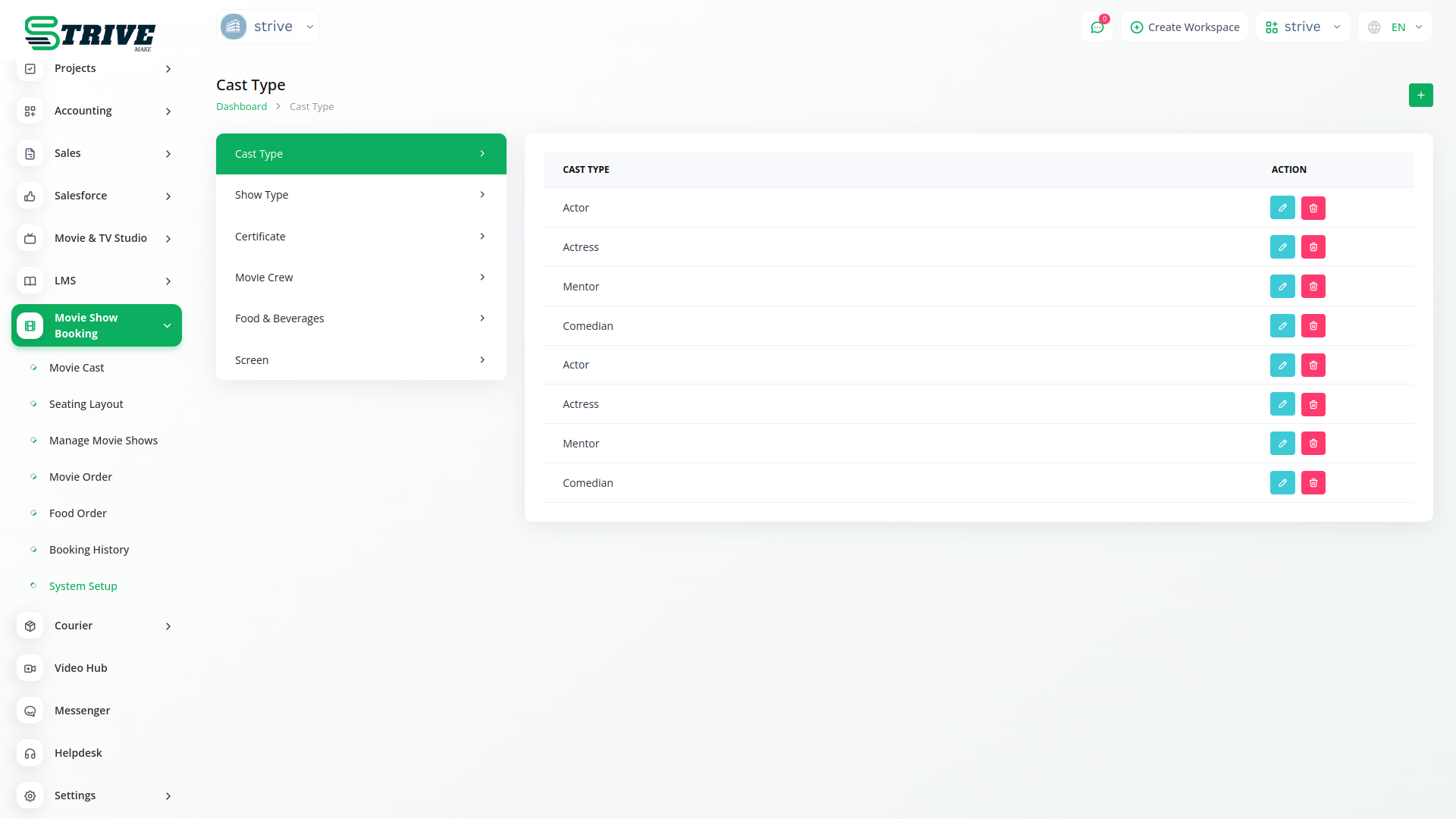 Take charge of your theaters configuration with StriveMake customizable system setup feature. Create new caste types, show types, certificates, and movie crew details according to your unique requirements. Customize the platform to reflect your theaters identity and streamline operations effortlessly.
