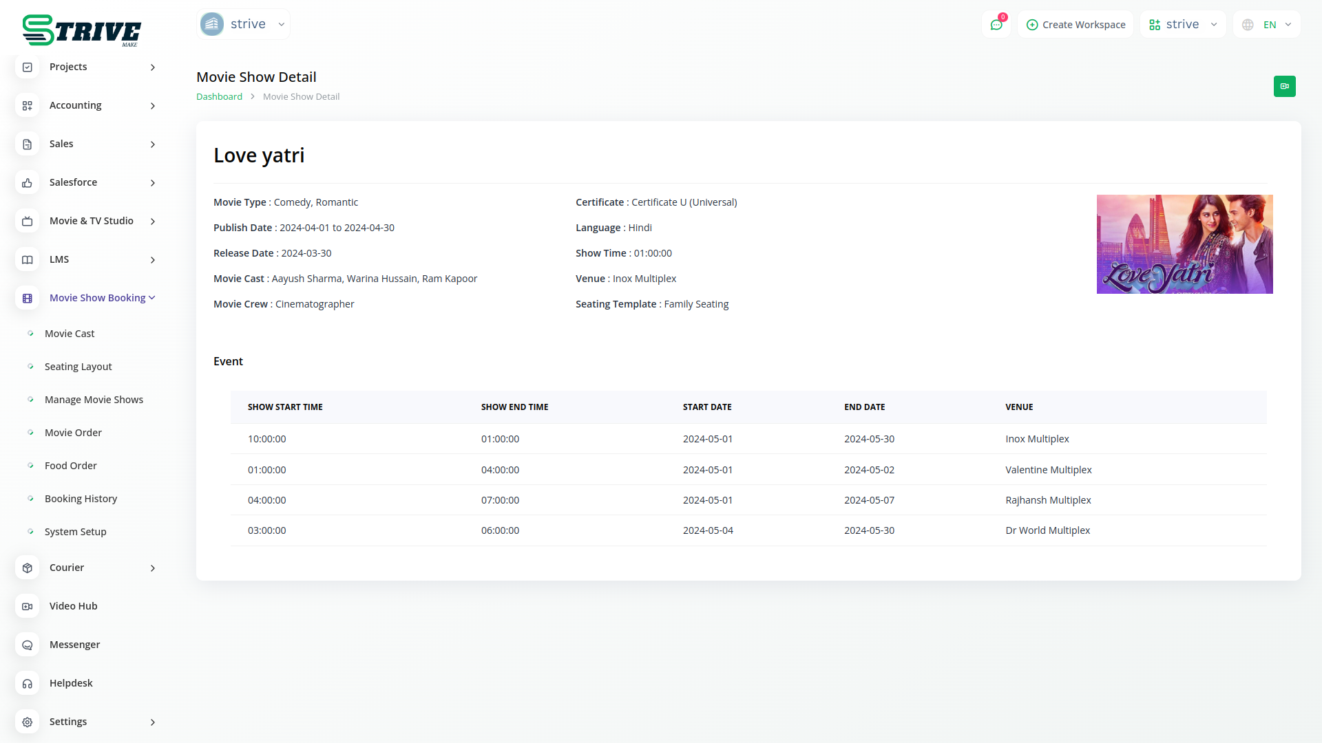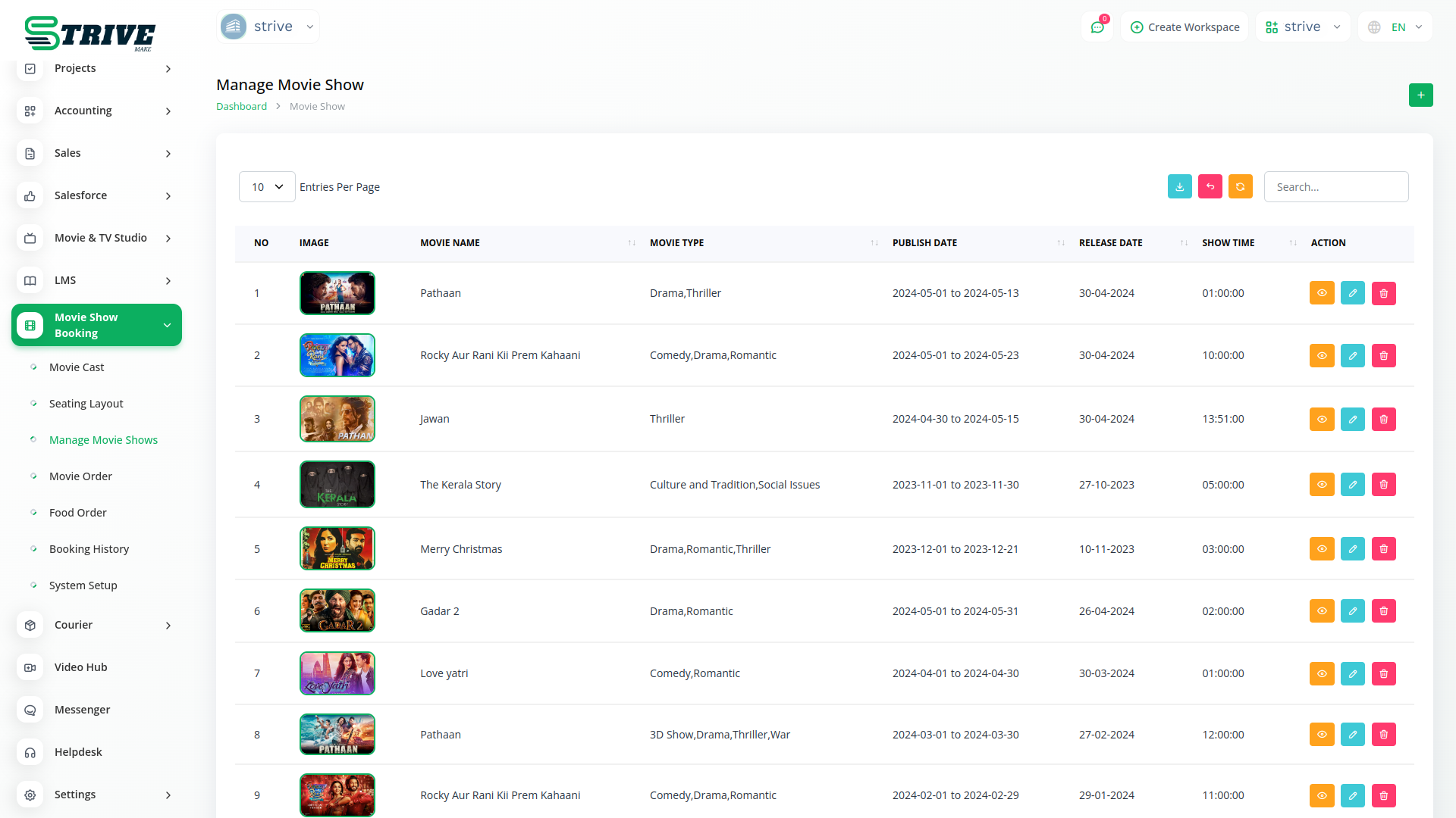 Manage movie shows seamlessly with StriveMake intuitive tools. From scheduling showtimes to allocating seating, our platform simplifies the process. Stay organized and in control as you oversee all aspects of your movie screenings with ease.