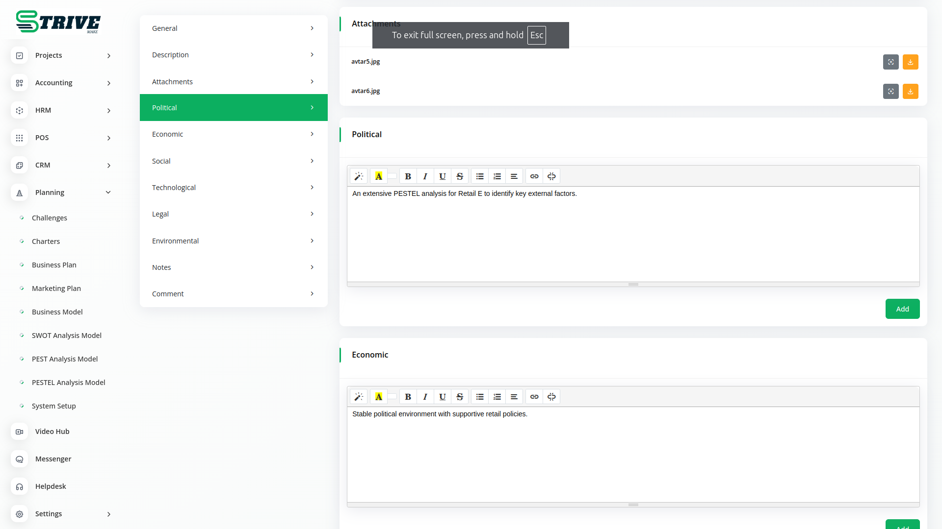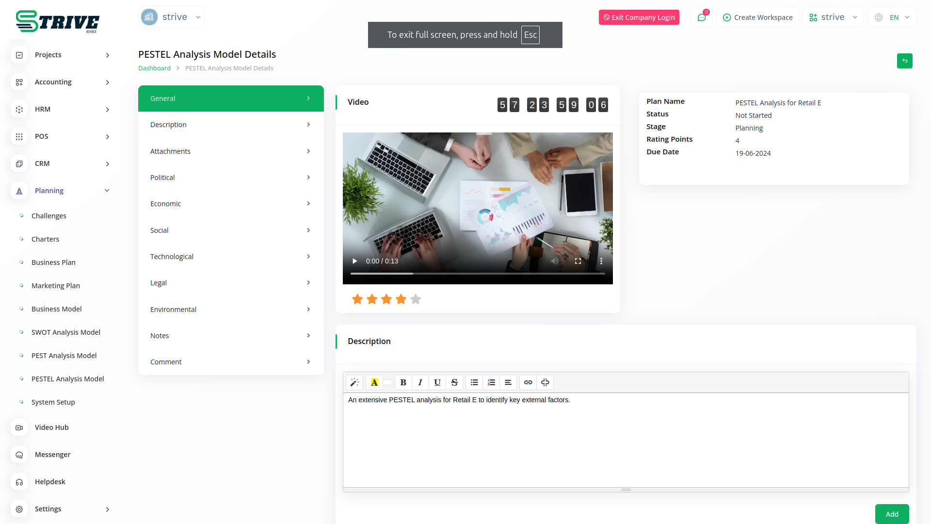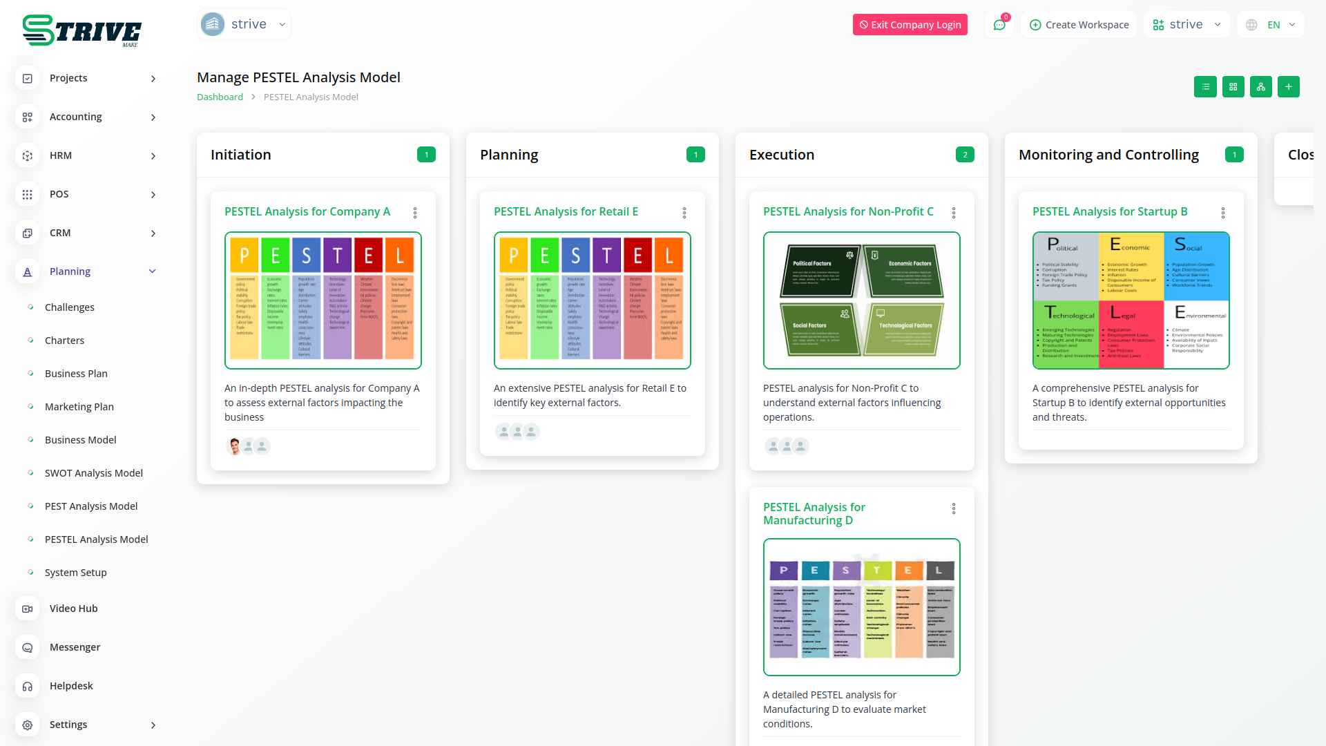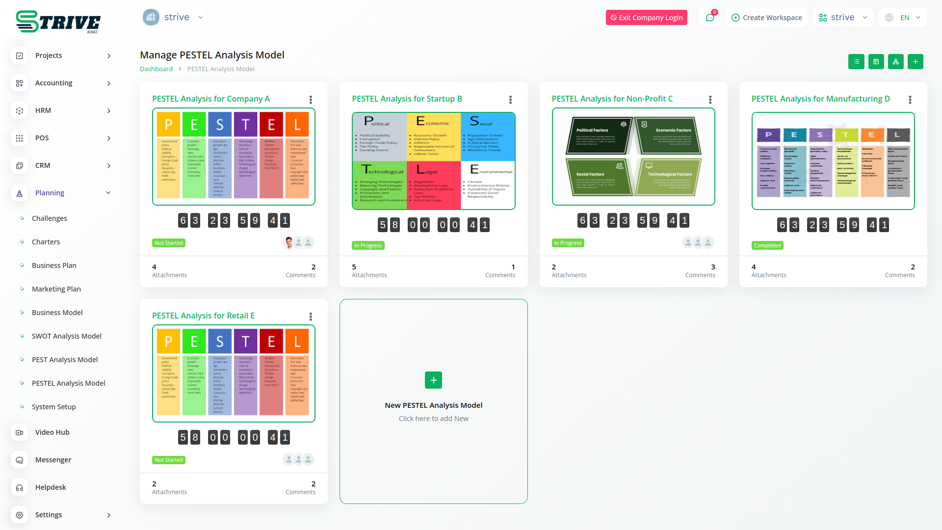 StriveMake is proud to introduce the integration of the PESTEL analysis model, a powerful tool for strategic planning and business decision-making. PESTEL, which stands for Political, Economic, Social, Technological, Environmental, and Legal factors, provides a comprehensive framework to assess the external environment impacting businesses. This integration enhances StriveMake capabilities, allowing users to conduct thorough analyses and gain valuable insights into their operating environment.