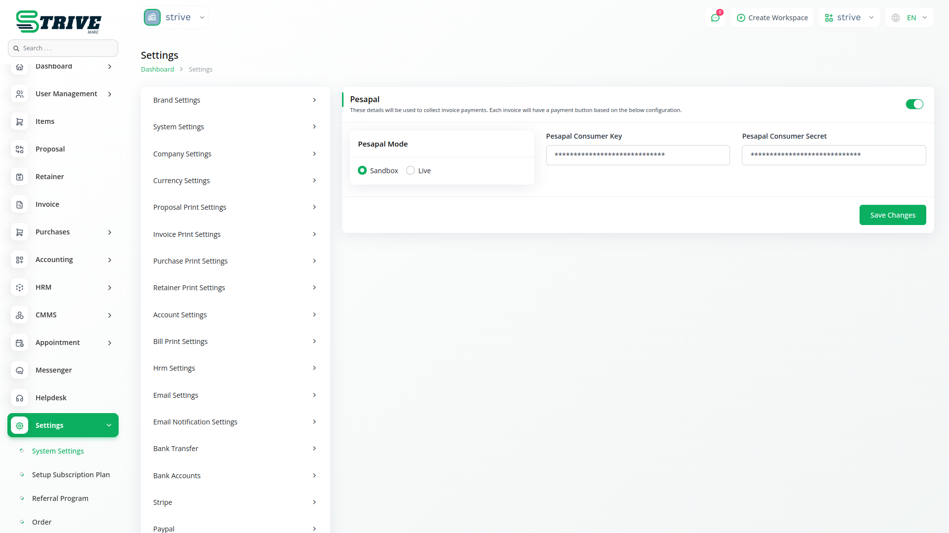The API Key Settings Page for PesaPal Integration allows you to securely connect your application or website with the PesaPal payment gateway. By configuring your API keys on this page, you enable your platform to interact with PesaPal services, providing seamless payment processing and transaction management. Both Superadmin and Company accounts can utilize this integration, though each has a specific focus. The Superadmin integration is primarily for handling subscription-based payments, while the Company integration handles payments related to invoices and other one-time transactions. Both roles share the same integration setup, ensuring ease of use and consistency across the platform.