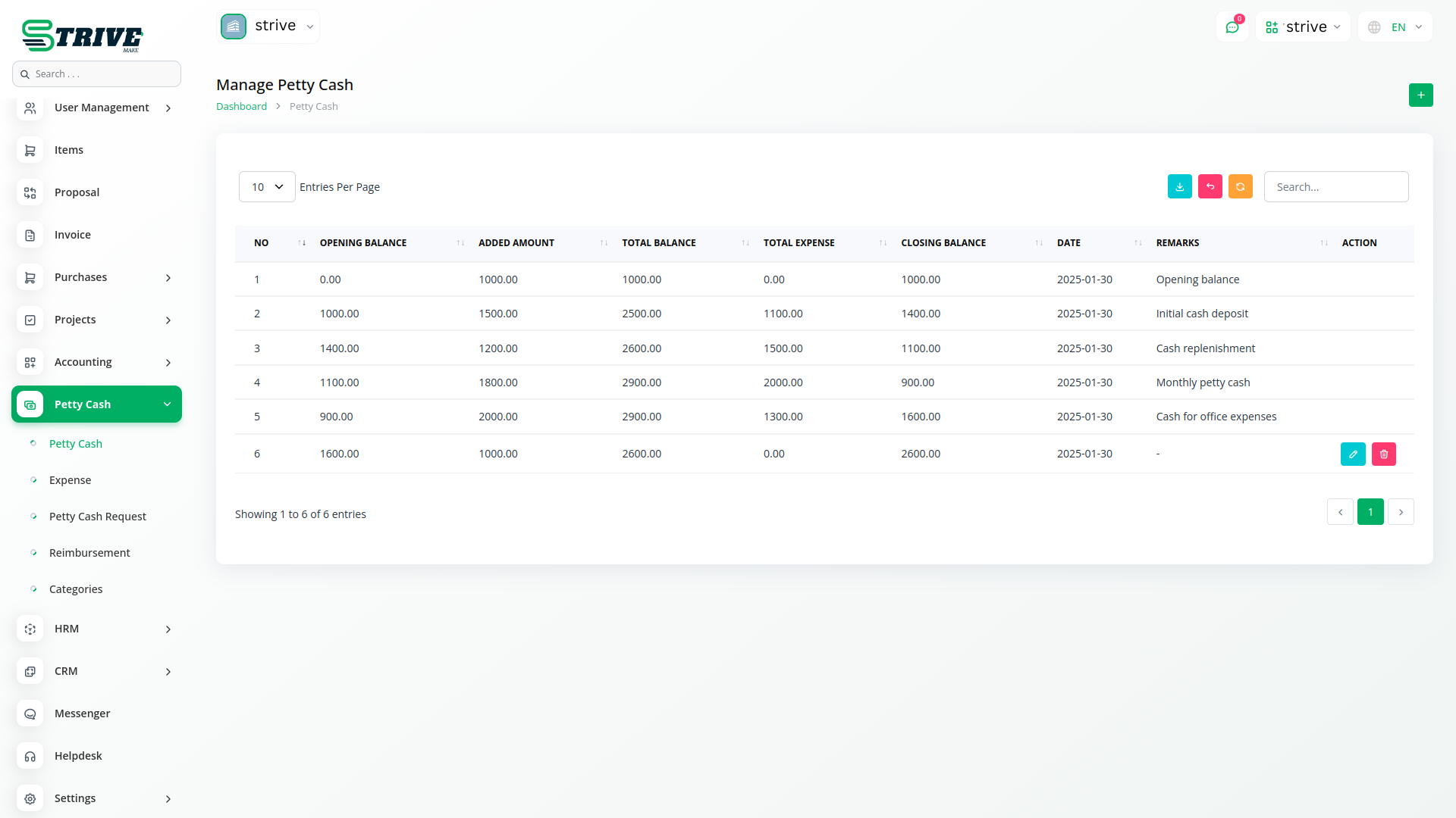 Easily track and manage petty cash expenses with the Petty Cash Management add-on in StriveMake