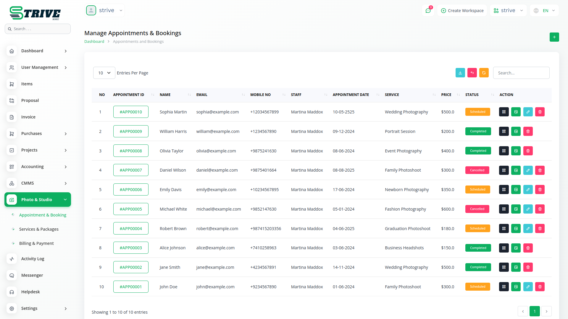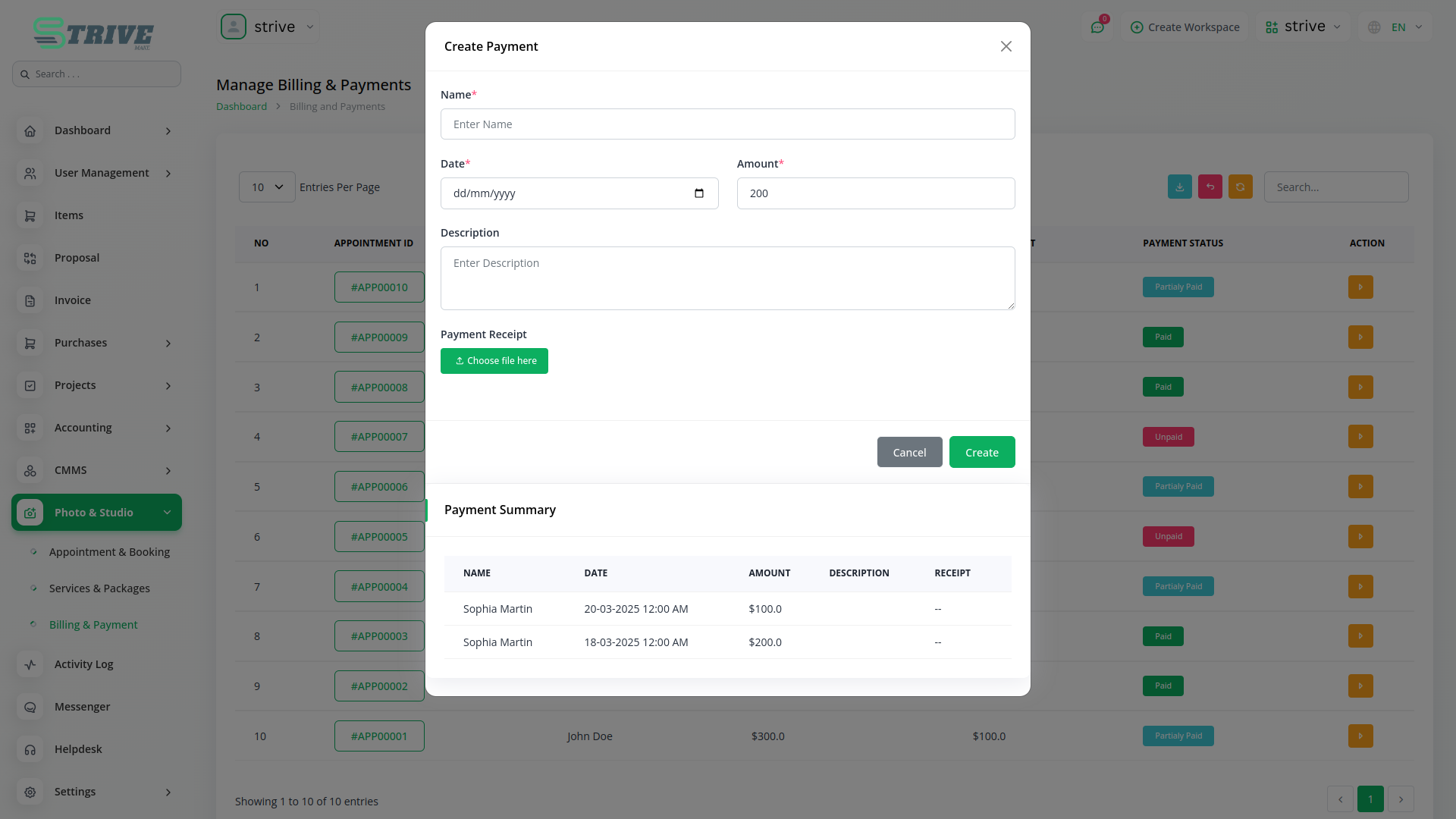 StriveMake provides a straightforward solution for billing and payment management in your photo studio. Once a booking or service is completed, you can easily add payments, track transactions, and generate receipts for your clients.