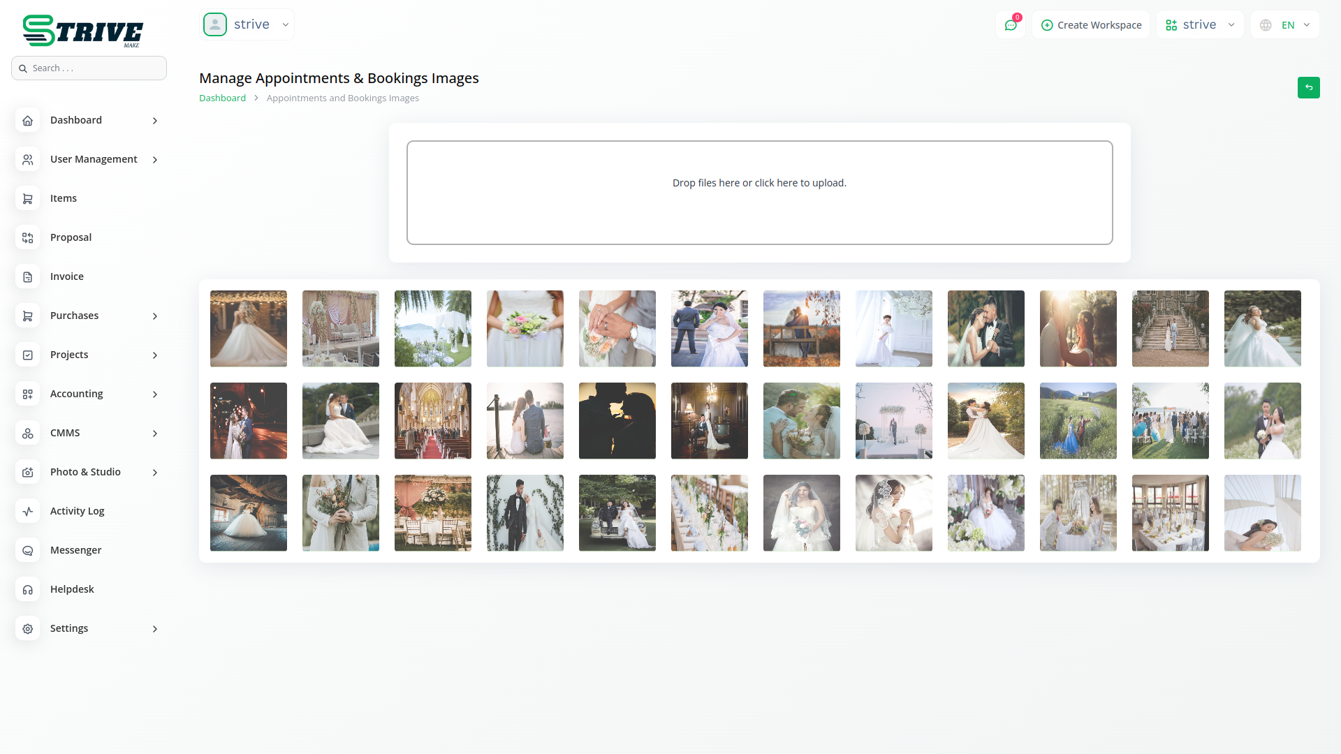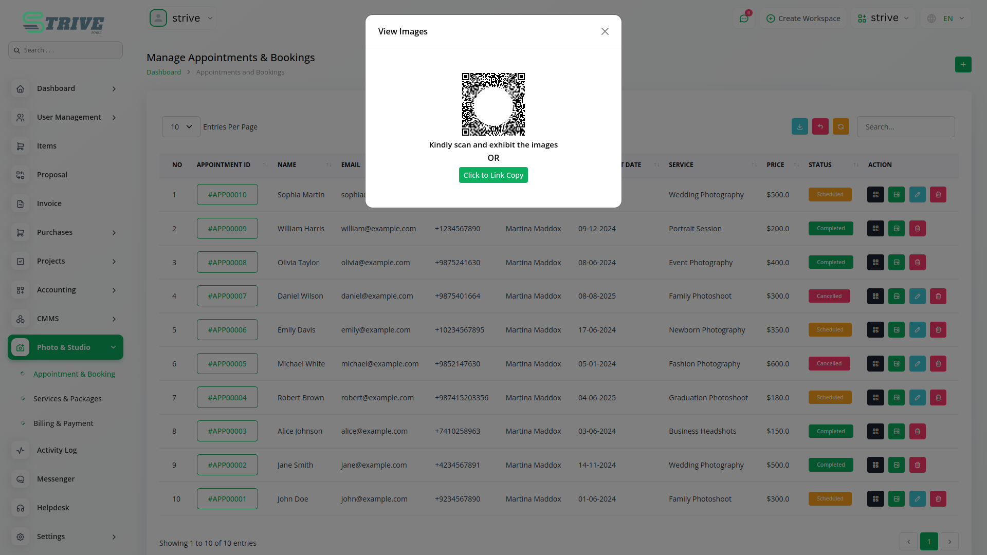 The Photo & Studio Management Add-On in StriveMake ensures seamless navigation to the booking page and provides a convenient way for clients to explore your portfolio before making their decision.your clients can effortlessly access the booking page and images.