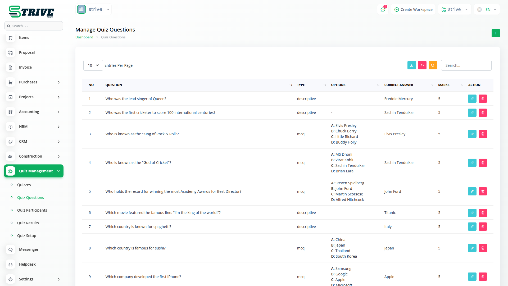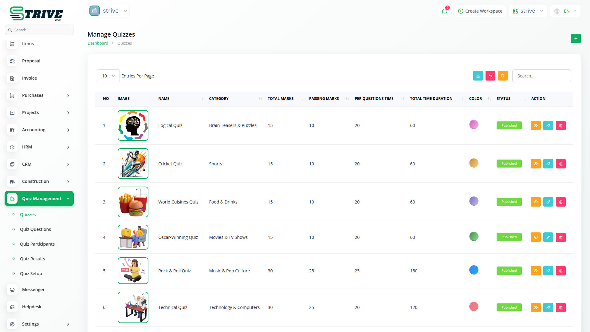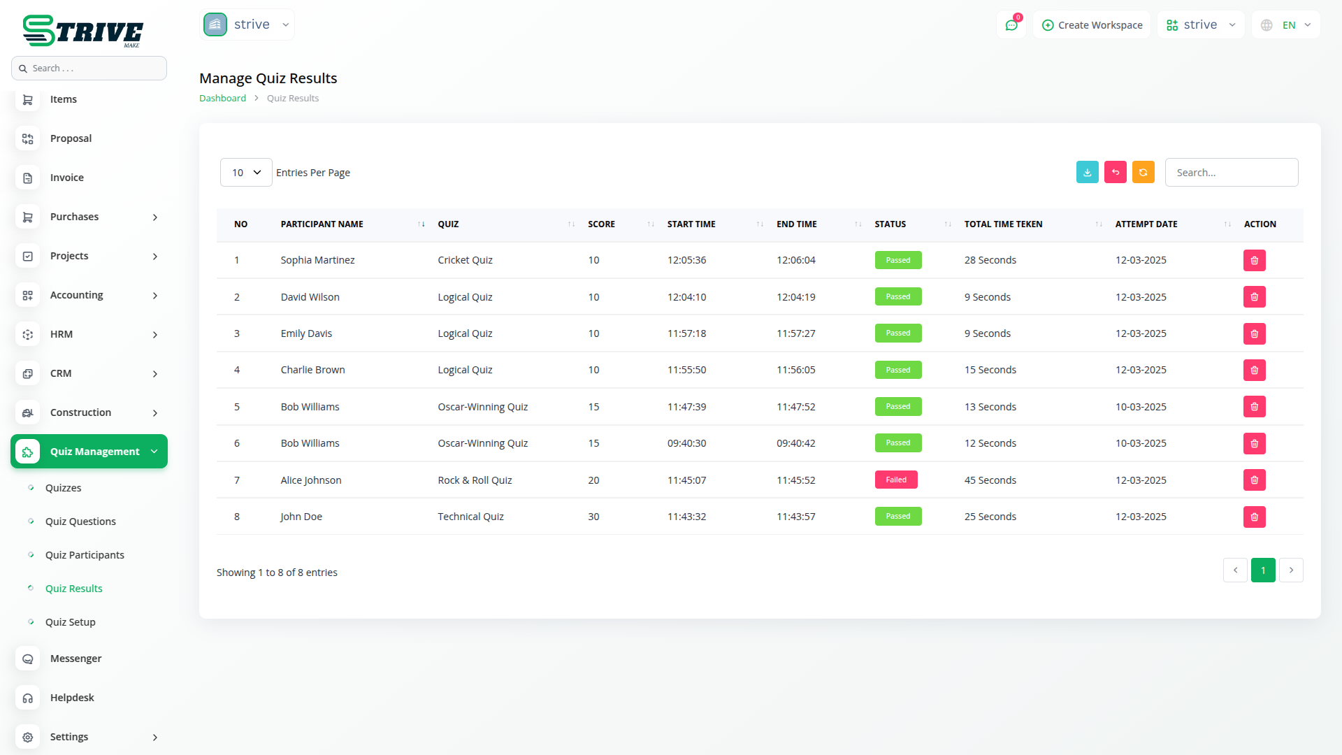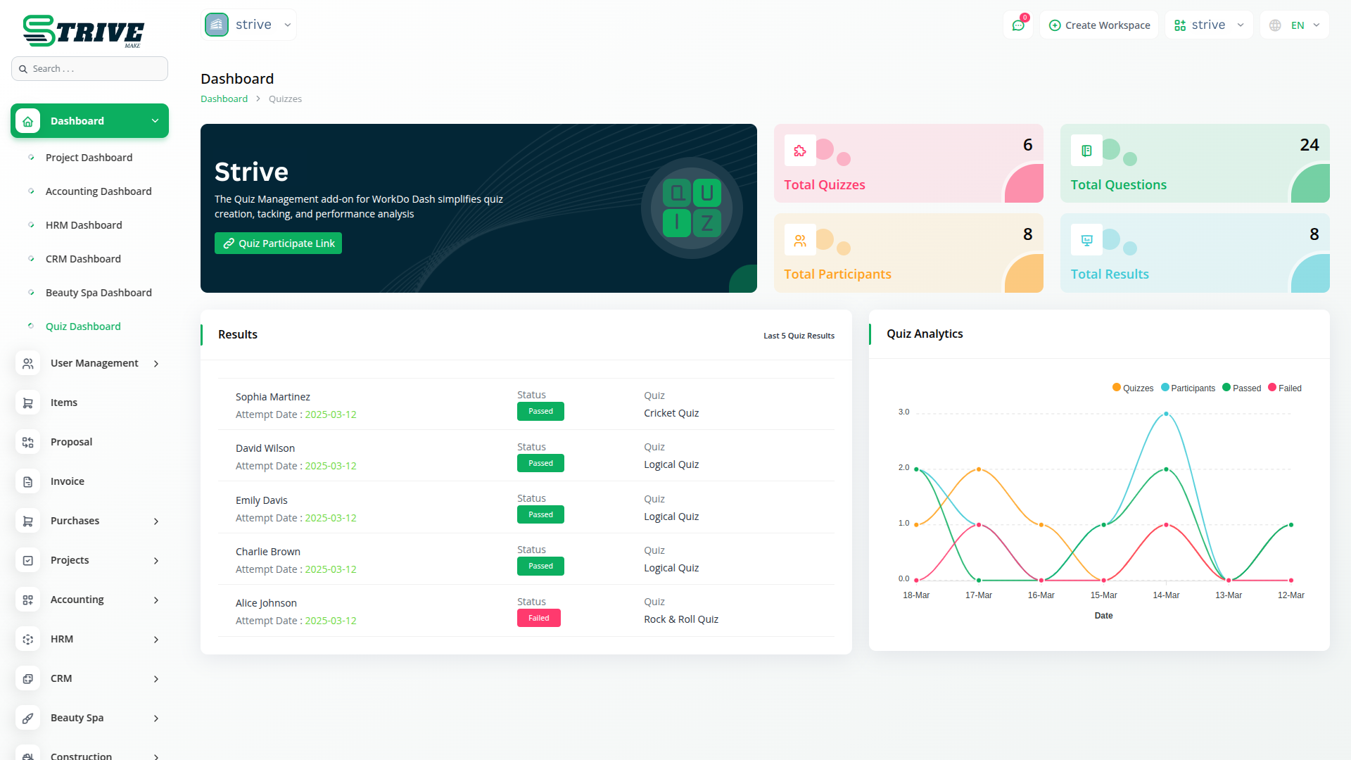 Manage quizzes, track progress, and enhance participant engagement effortlessly with StriveMake's Quiz Management Module.
