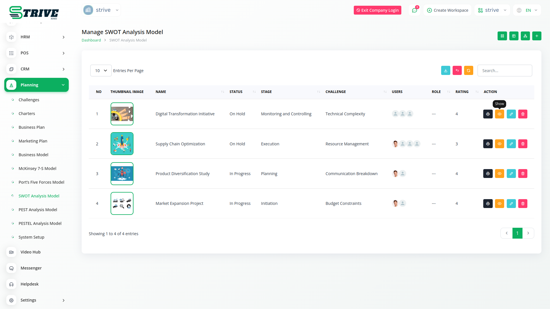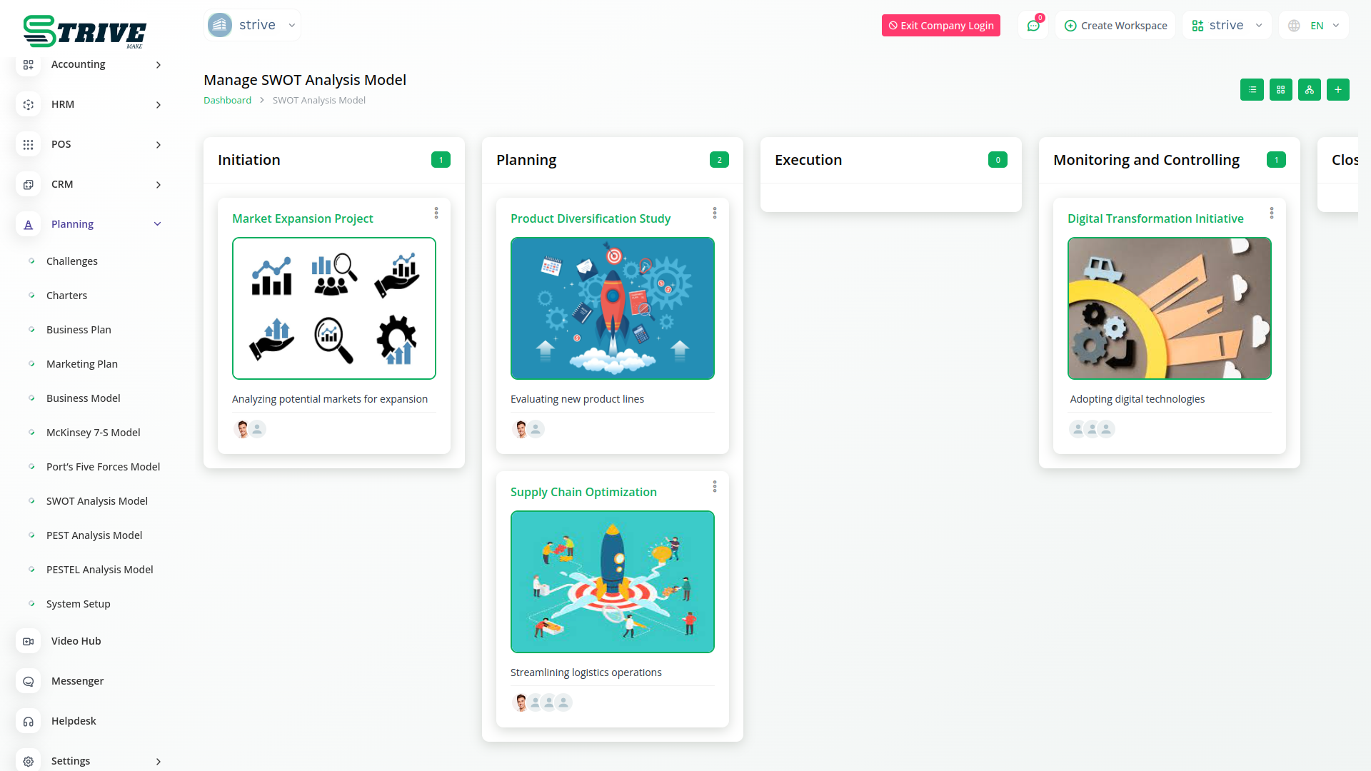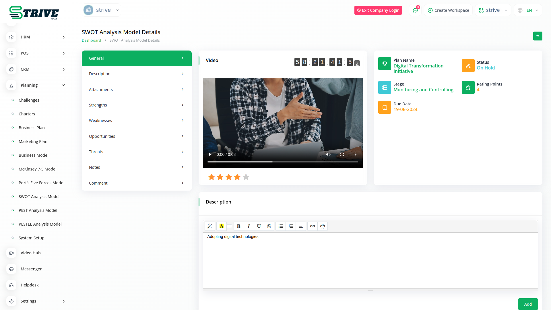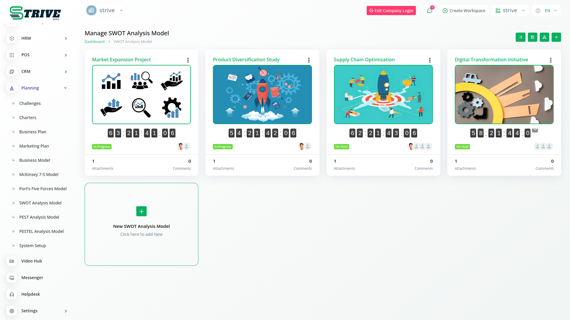 The StriveMake SWOT Analysis Module empowers businesses with a structured framework to evaluate their Strengths, Weaknesses, Opportunities, and Threats. This powerful tool is designed to provide clear insights into your organizations internal and external factors, helping you make informed strategic decisions.