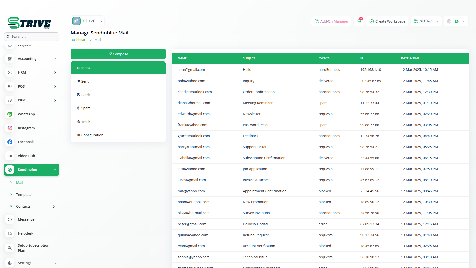 With the Sendinblue integration, users can not only send emails but also access their inbox directly within StriveMake. To enable this feature, the API Key must be added, granting users complete visibility over received messages. This centralized inbox management allows businesses to monitor responses, track customer interactions, and maintain efficient communication.