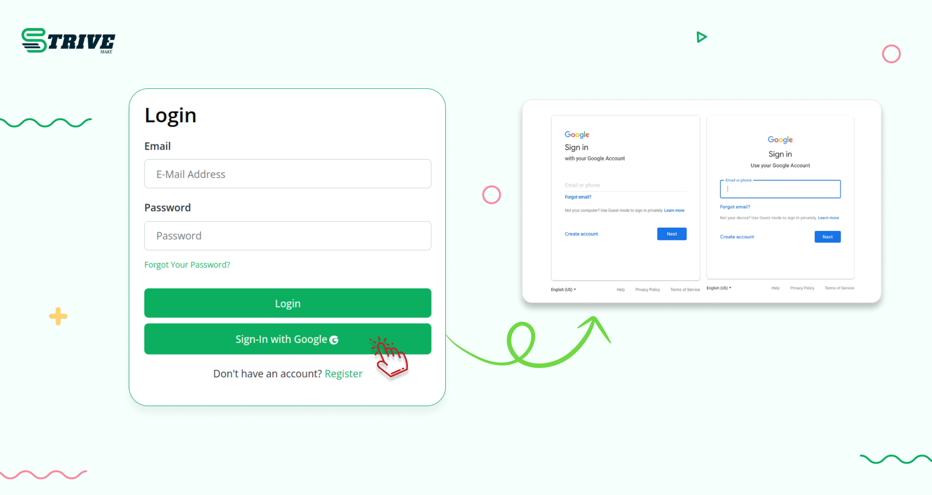 Effortlessly log in with your Google account using StriveMake Sign-In with Google module.