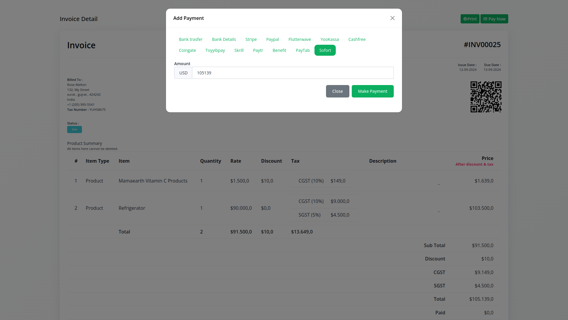 Streamline your payment process with the Sofort Payment Gateway, featuring efficient electronic invoicing (retainer and sales), plan payments, and secure payment initiation and authorization. Seamlessly use this gateway to handle not just invoices and plans but also to purchase multiple add-ons, enhancing your business capabilities with ease.