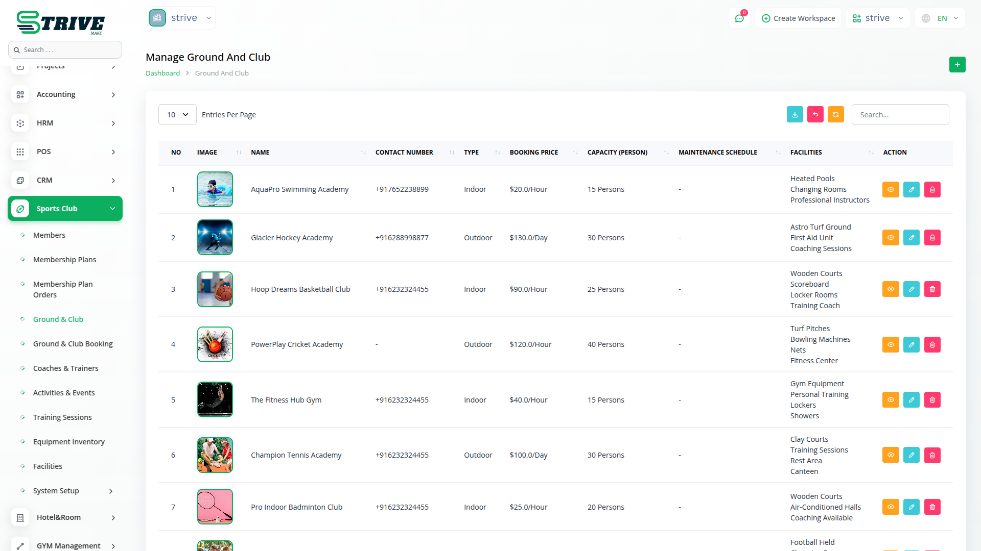 Managing clubs and sports grounds becomes easy with this feature. You can set up multiple clubs or ground venues, define their capacity, type, contact details, and venue locations. Schedule maintenance, add multiple images, and assign relevant facilities such as lighting, parking, or changing rooms for each location. Helps maintain all club infrastructure in one place.