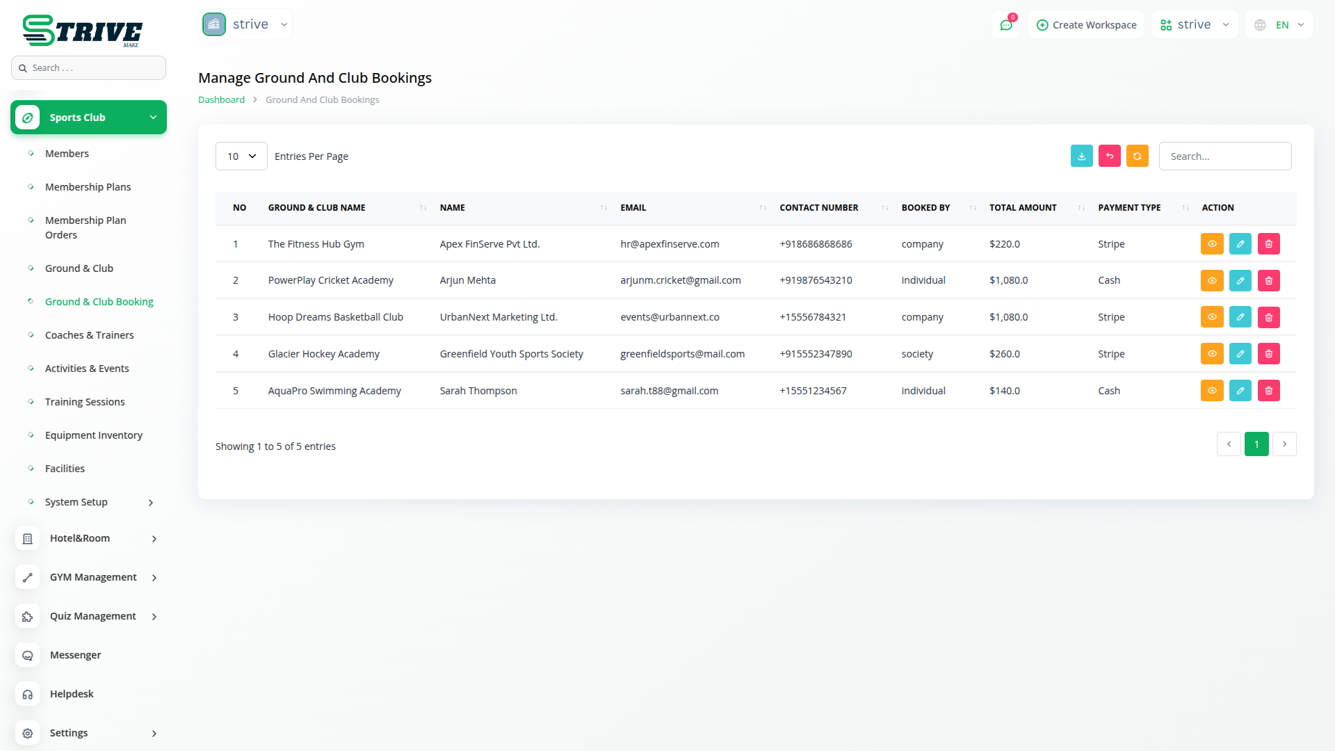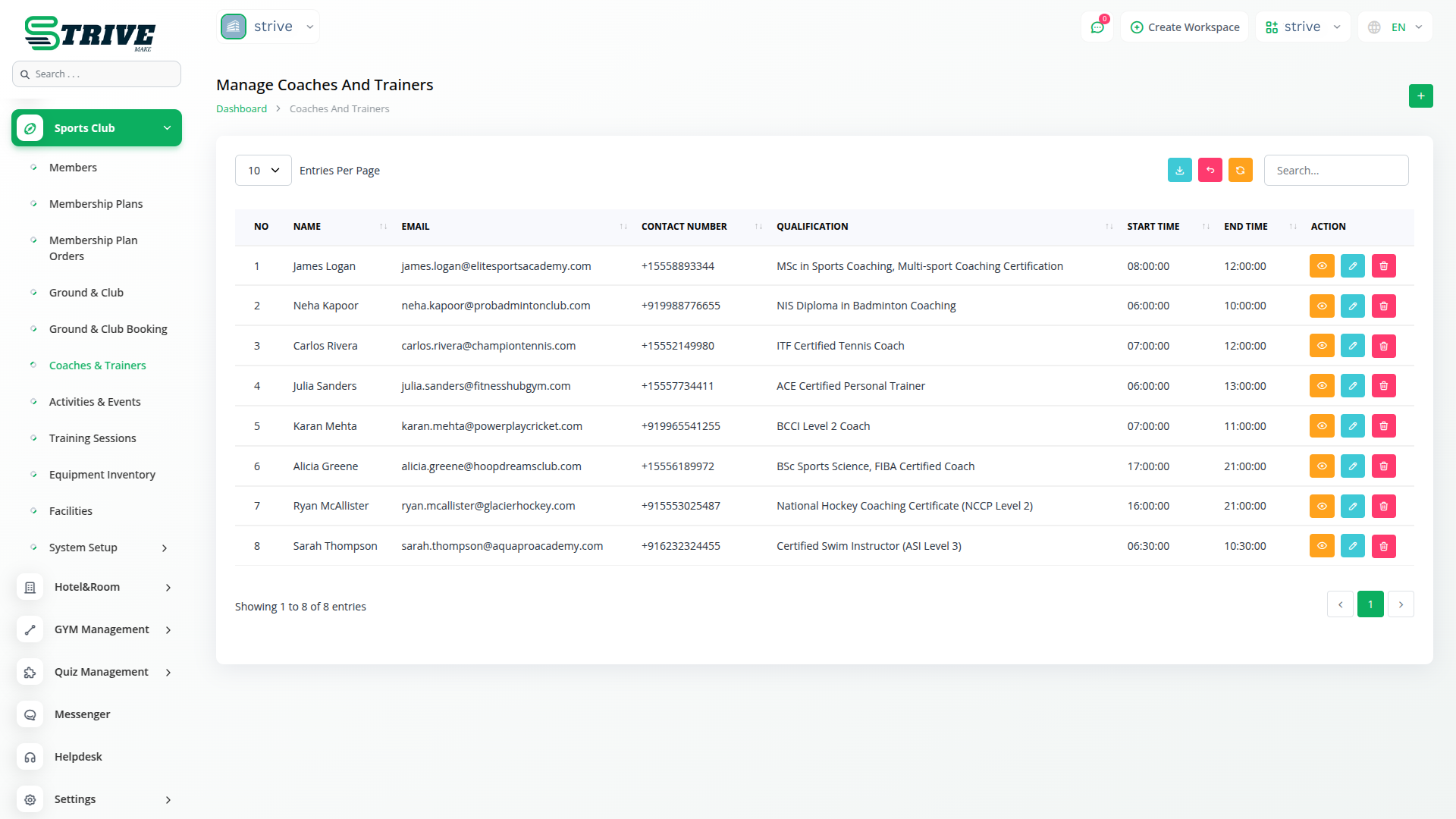 Maintain a professional roster of all coaches and trainers with details like specialization, working hours, qualifications, and contact info. Assign them to training sessions and view their schedules at a glance. This feature ensures coaching resources are allocated efficiently and activities run smoothly.