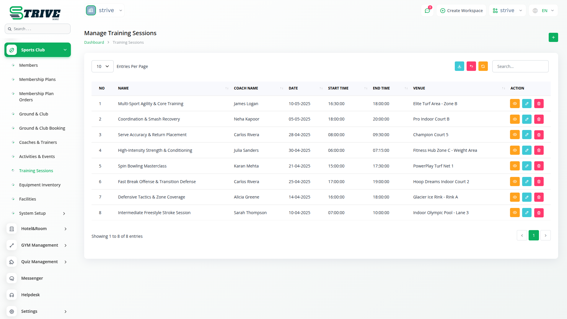 This feature helps schedule and manage training sessions with coaches and members. Plan sessions by setting dates, time slots, venues, and session notes. Add members to specific sessions and coordinate with trainers to ensure well-organized practice schedules.