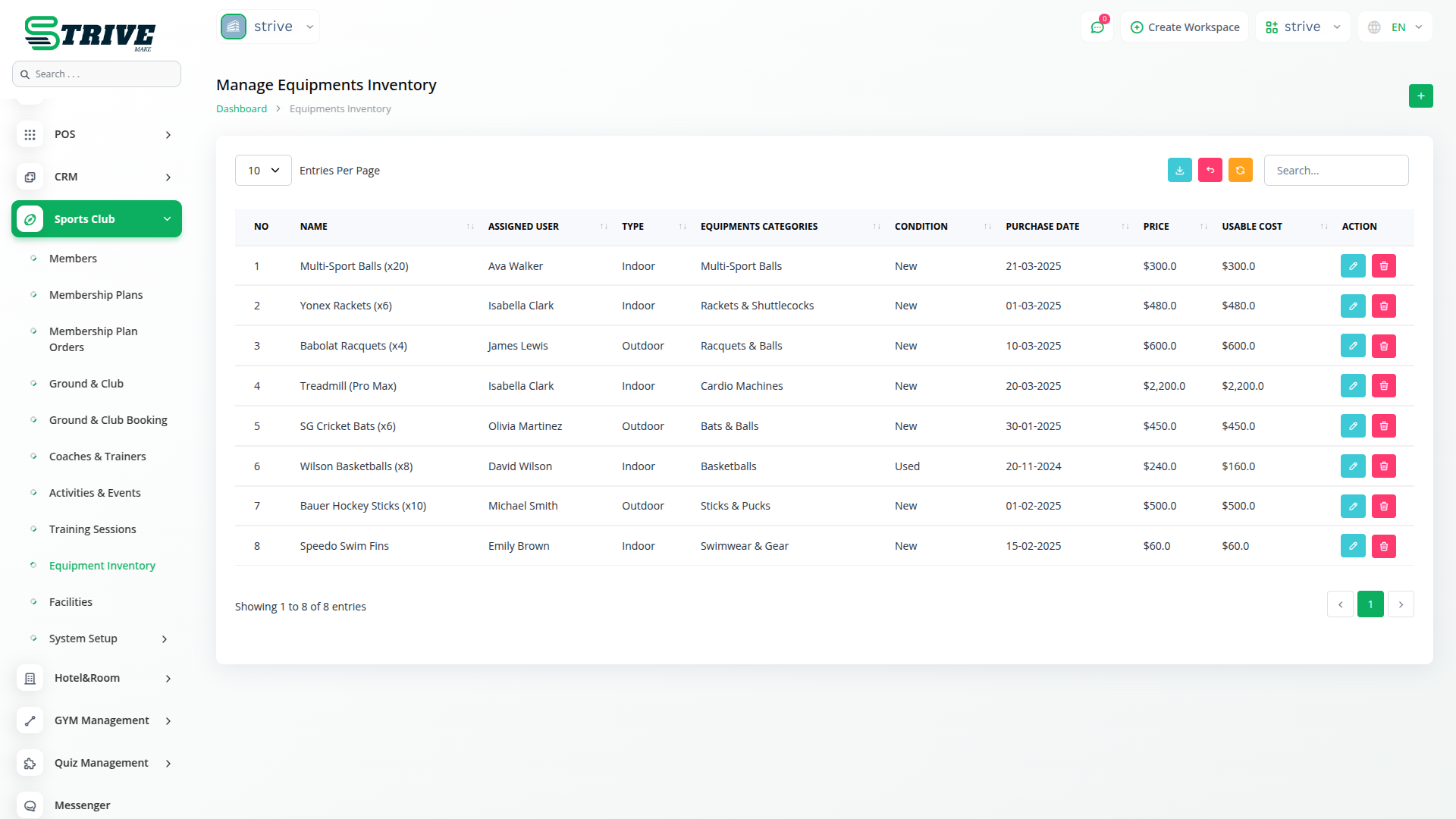 Track and manage your club’s sports equipment with full visibility into condition, category, assigned user, purchase date, and pricing. Assign gear to members or staff, monitor usage, and ensure that essential equipment is always in stock and functional.