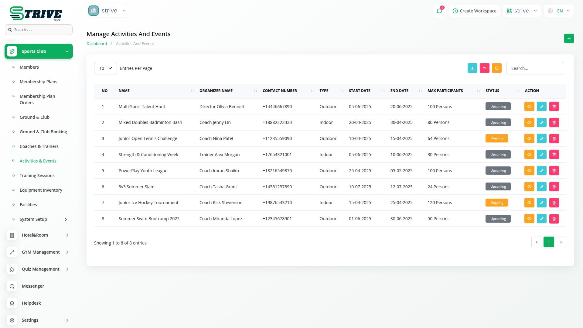 Organize and manage sports events, matches, tournaments, or social club activities effortlessly. Set up each event with organizers, participant limits, dates, venue, and contact info. Track the progress and status of each activity to ensure everything runs on time.