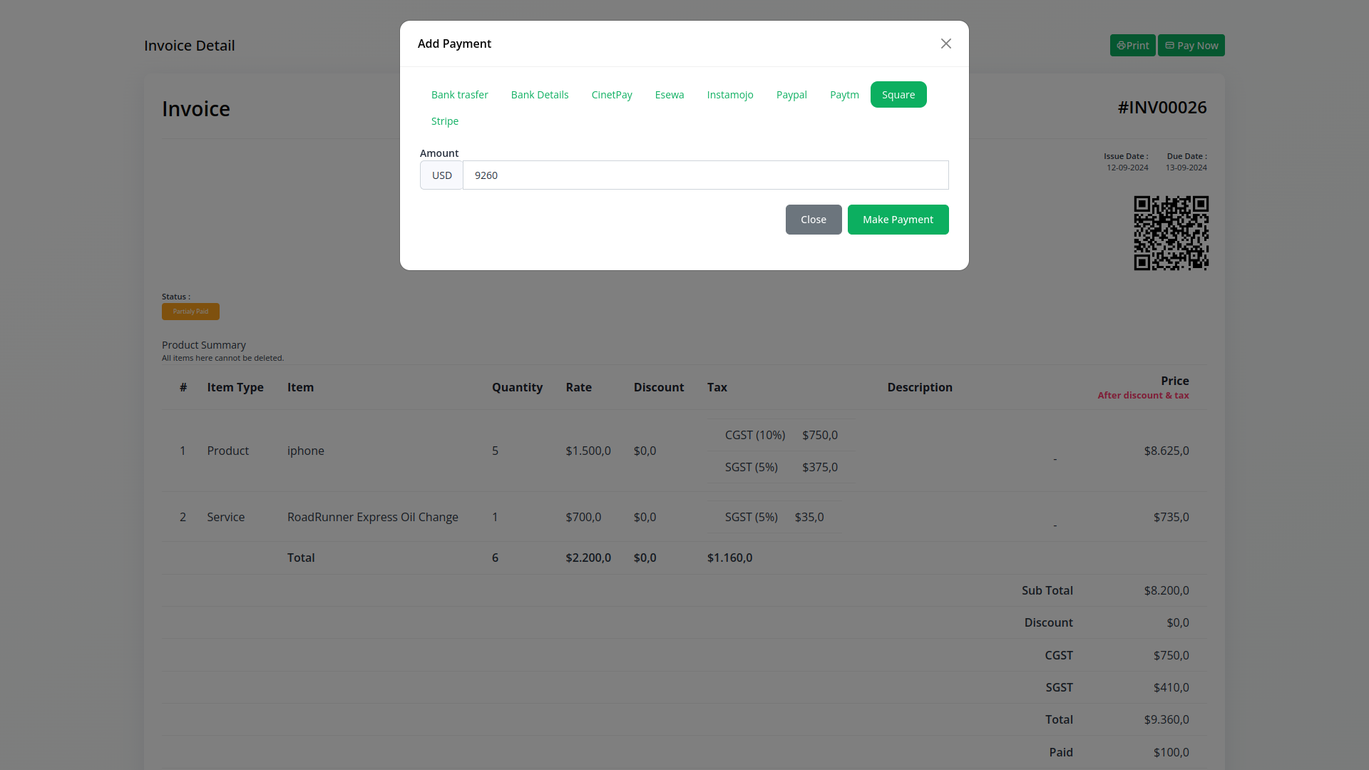 Optimize your payment process with the capability to generate electronic invoices (both retainer and sales), facilitate plan payments, ensure secure delivery, and enable easy payment initiation and authorization through the Square Payment platform. By incorporating Square Payments into StriveMake, you can simplify and secure your payment processes, providing a smooth experience for both your business and your customers.