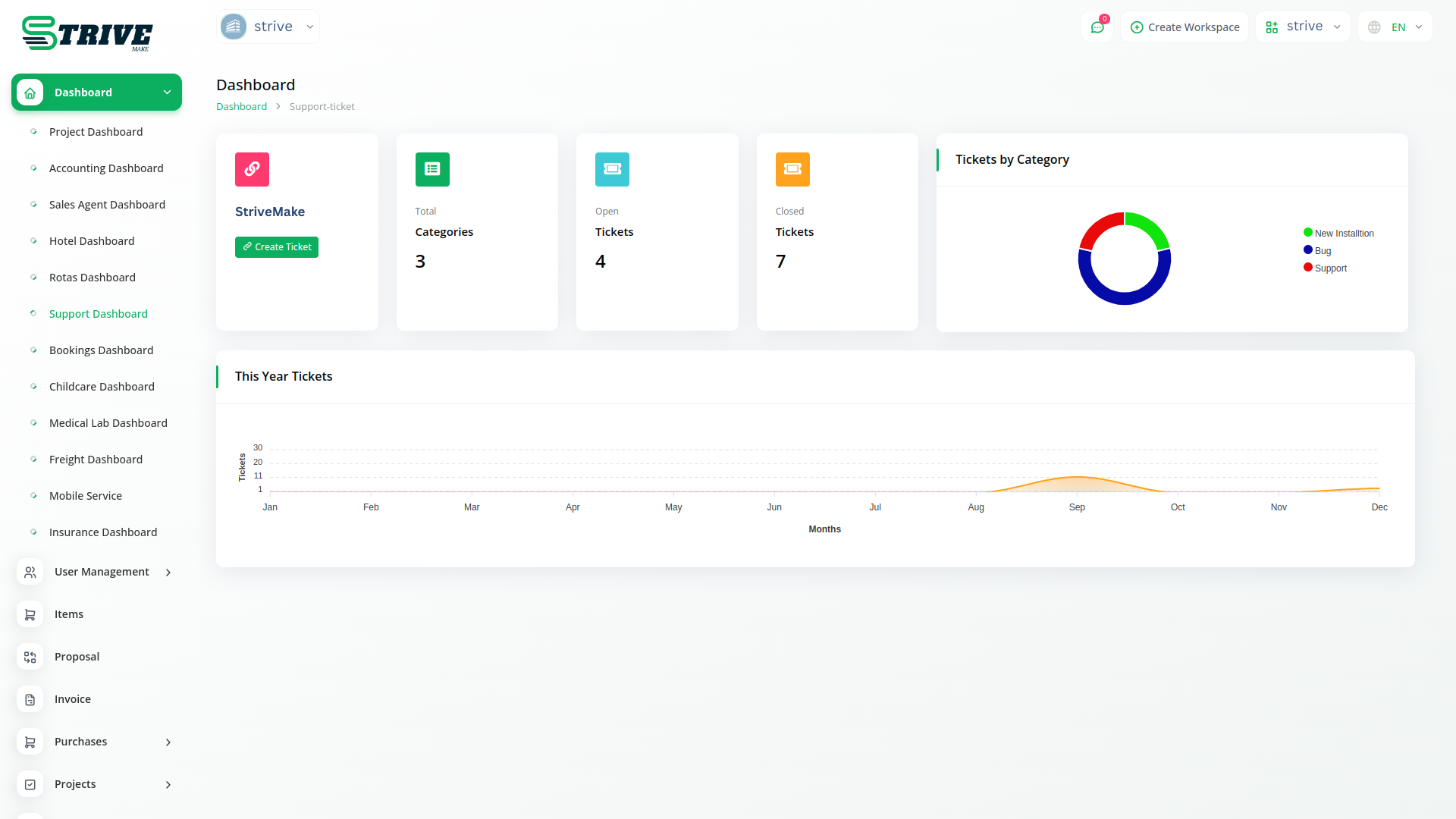 Get easy access to open and closed ticket statistics. A visual presentation of categories and a monthly generated ticket chart are presented.