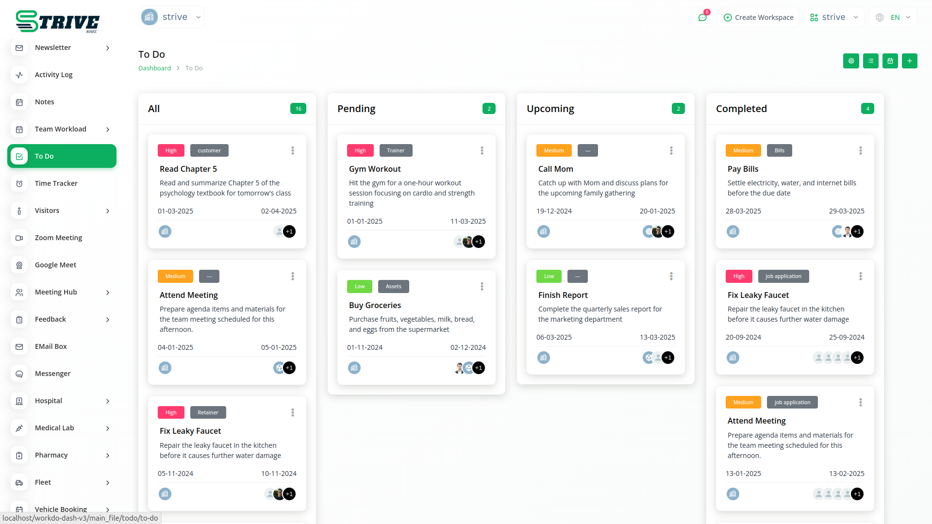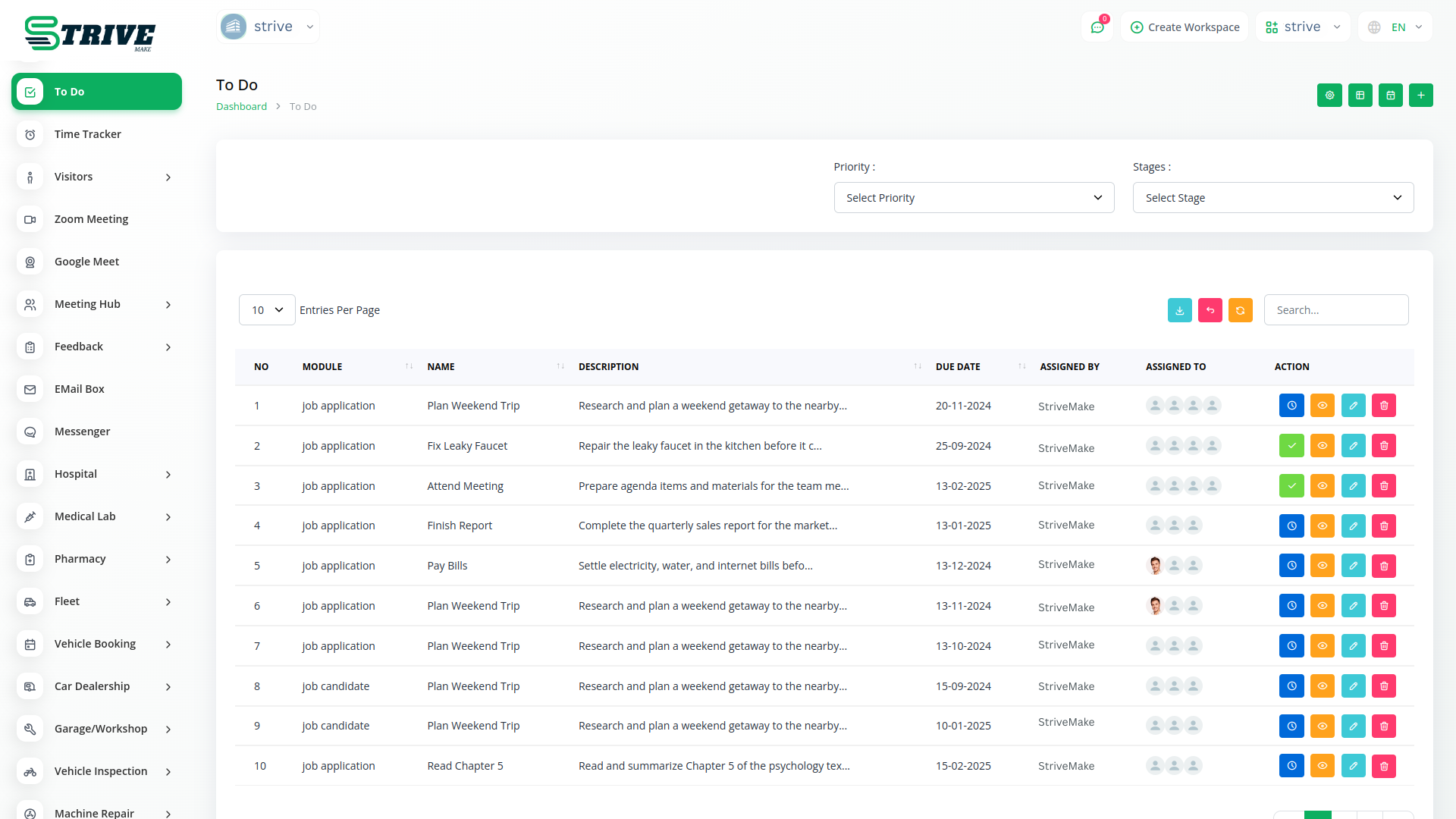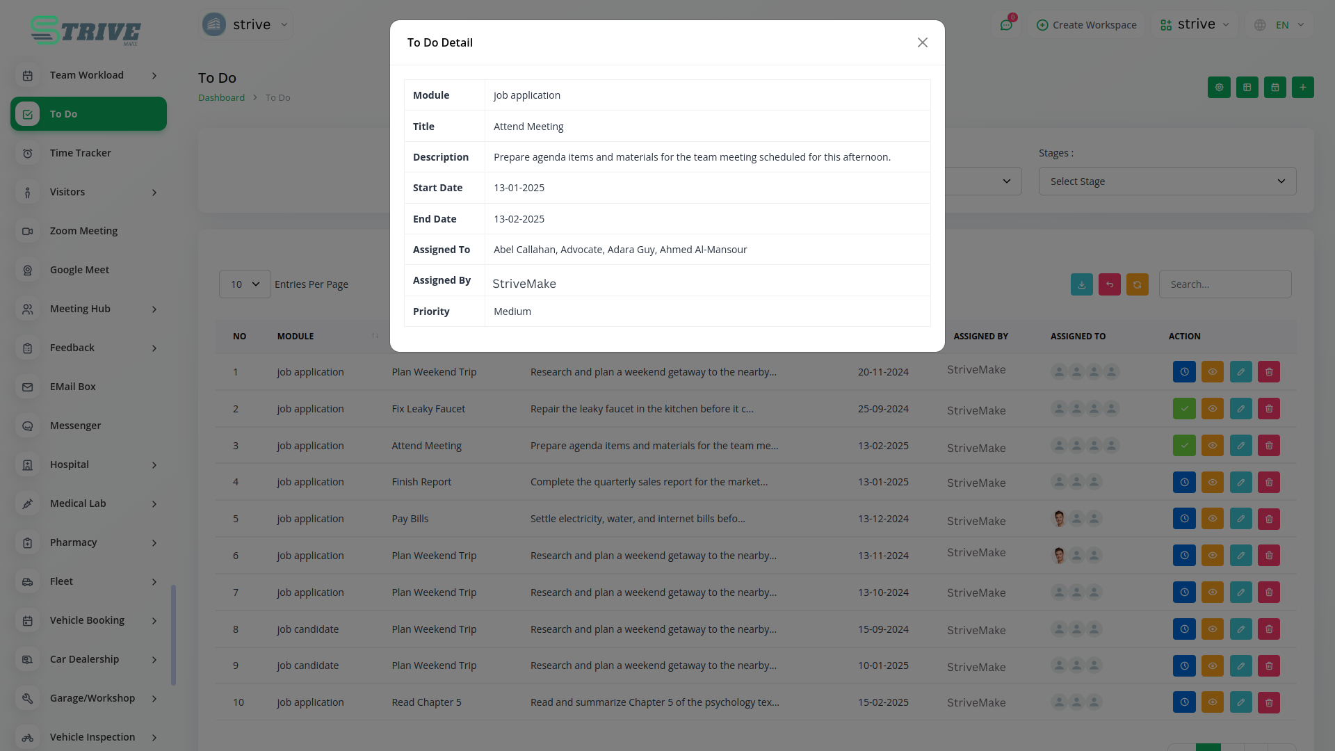 Effortlessly manage task stages, meetings, and personal ToDo lists within StriveMake, streamlining your workflow for enhanced productivity and organization.