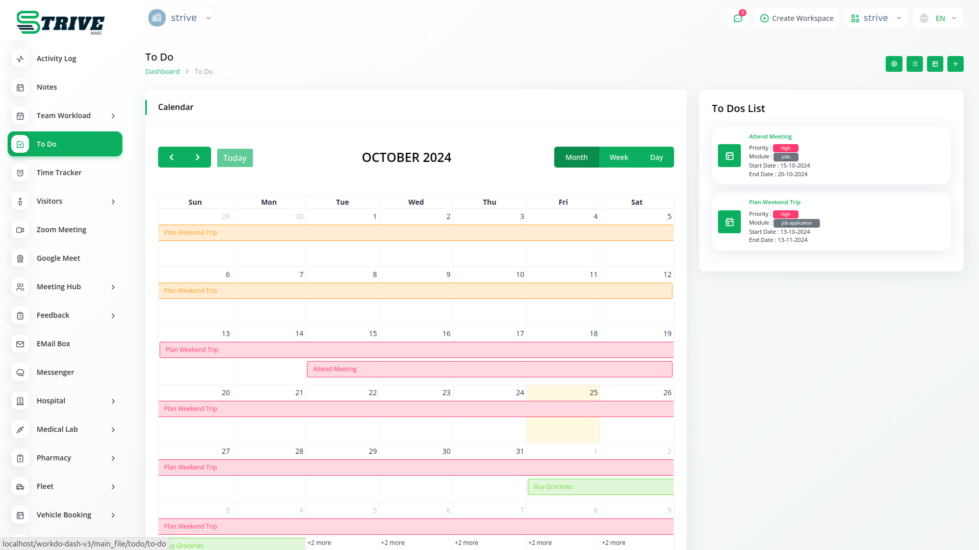 Visualize your tasks and appointments with the calendar view feature in StriveMake's ToDo module. Plan your schedule effectively by seeing tasks alongside meetings and deadlines in a comprehensive calendar layout. With this intuitive visualization tool, manage your time efficiently and prioritize tasks based on their due dates and importance. Stay organized and on top of your commitments with StriveMake's seamless integration of task management and scheduling capabilities.