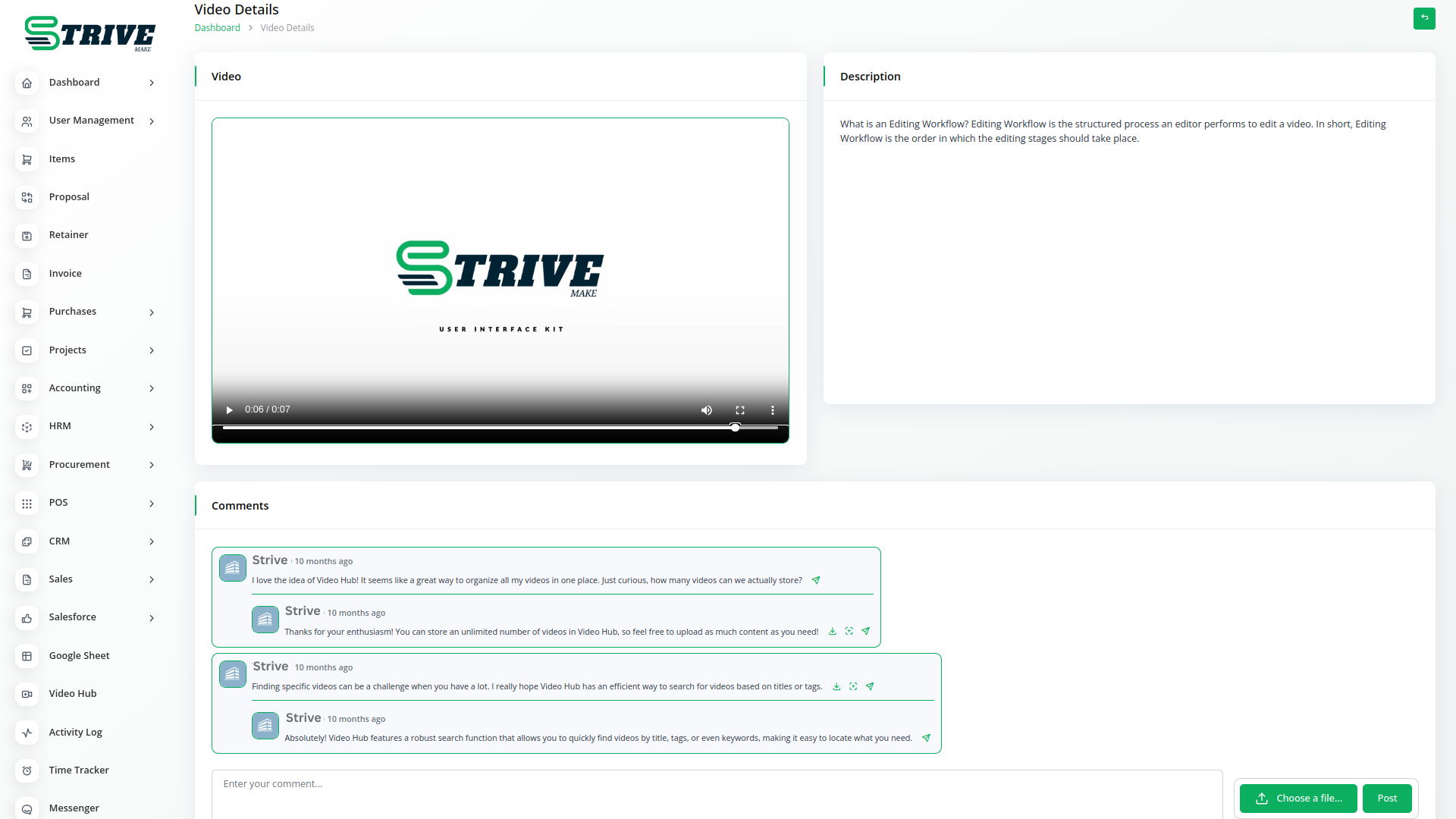 Click on the thumbnail or video title. Then you can see a page similar to the given photo. And you can view video, video description, comment box and easily add comments and files in comment box.