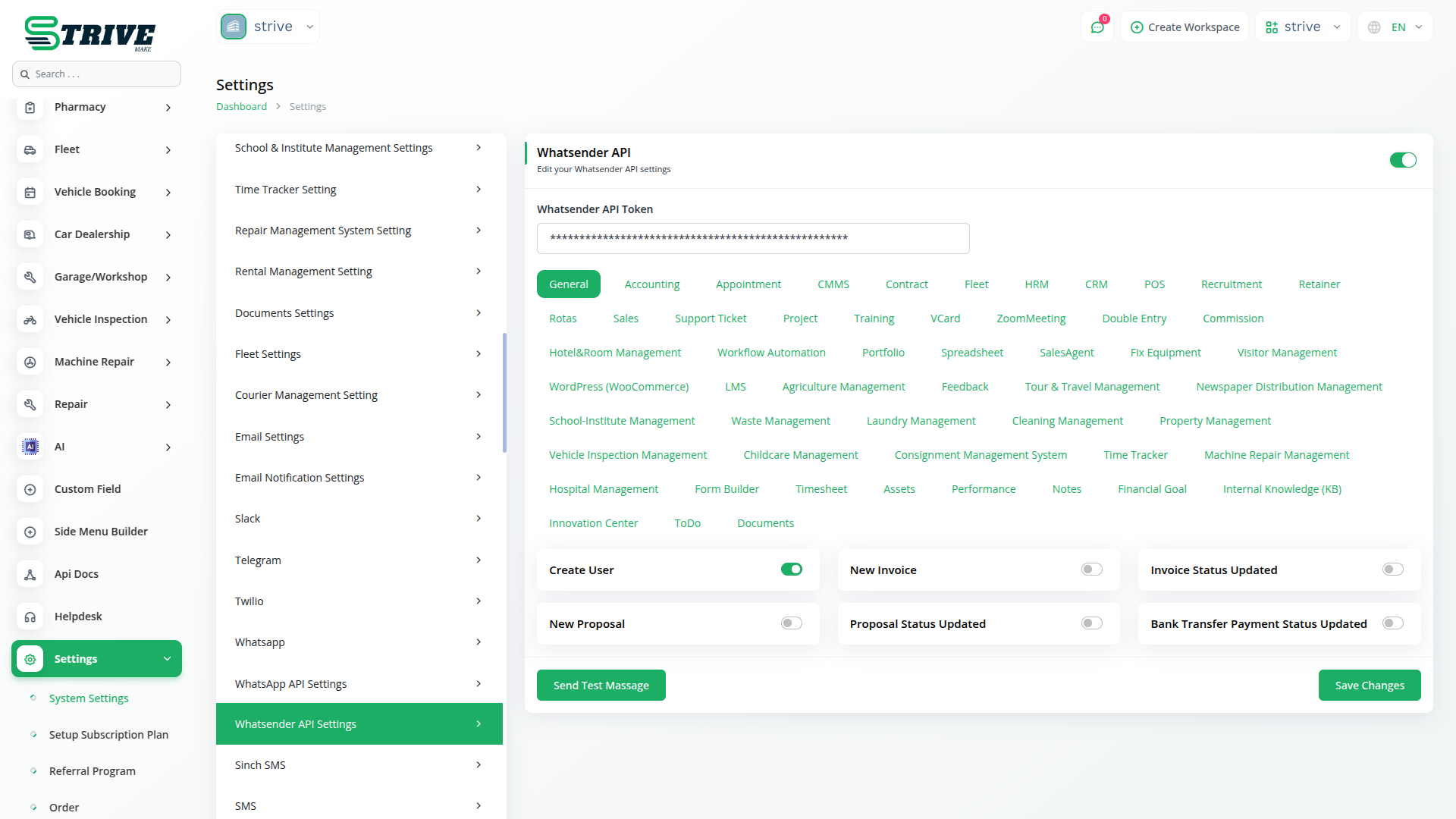 Designed for flexibility, the Whatsender module allows users to enable or disable specific notifications based on operational requirements. Businesses can automate s for events such as new invoices, proposal status updates, bank transfer payment confirmations, and user creation. The module also features a test messaging function to validate API configurations before implementation, ensuring smooth and reliable message delivery. This level of customization makes it an essential tool for businesses looking to enhance communication efficiency.